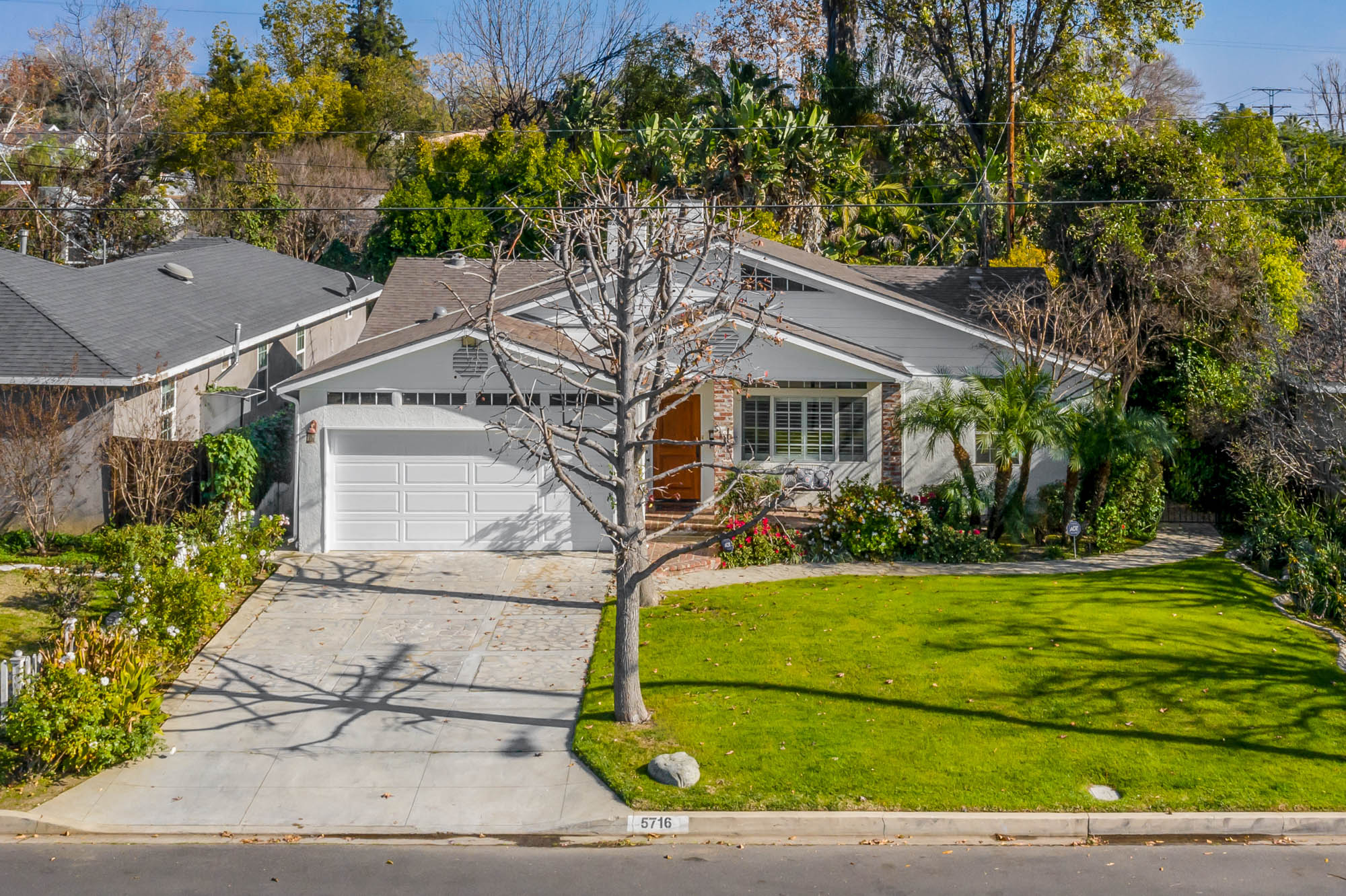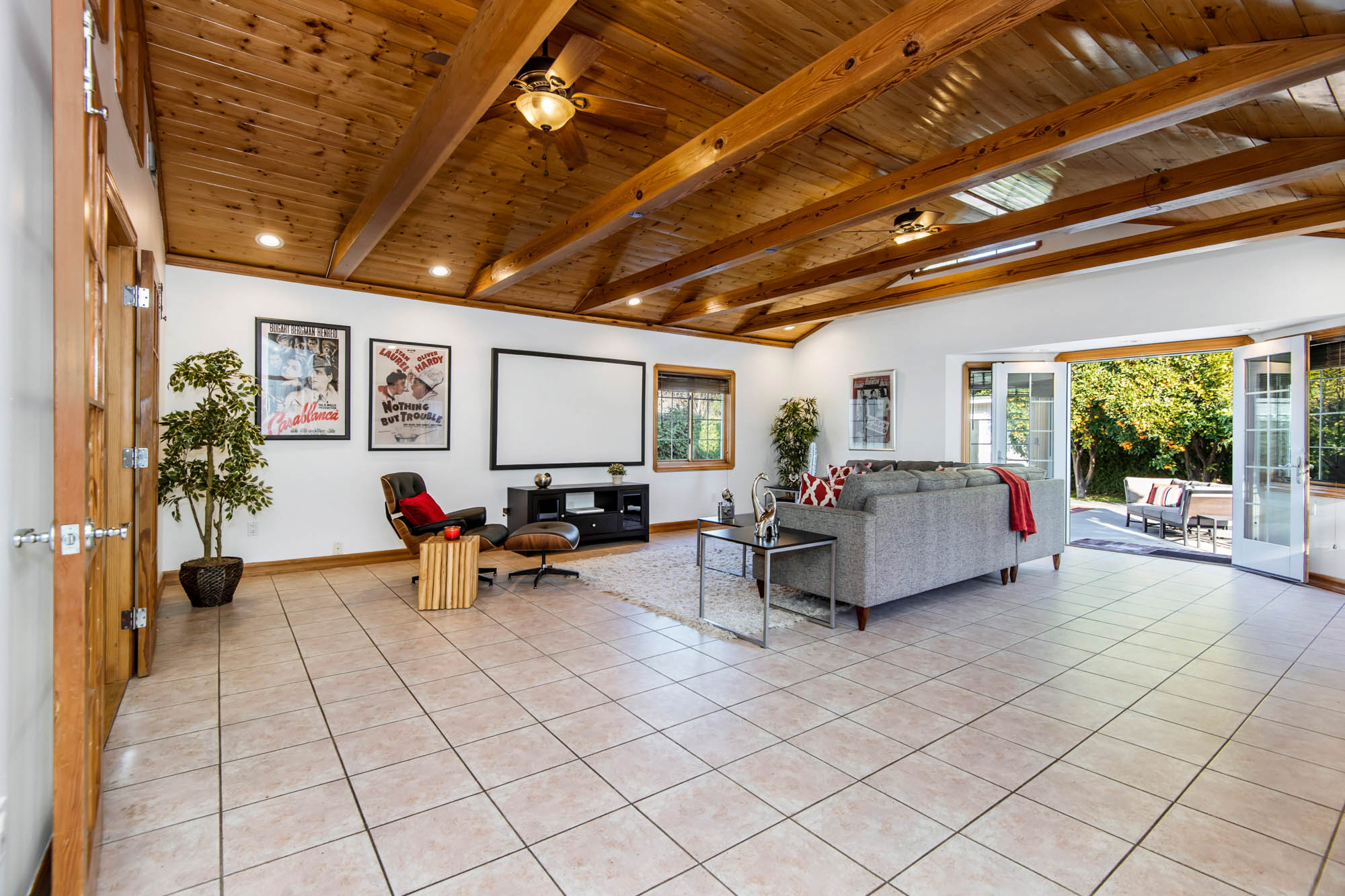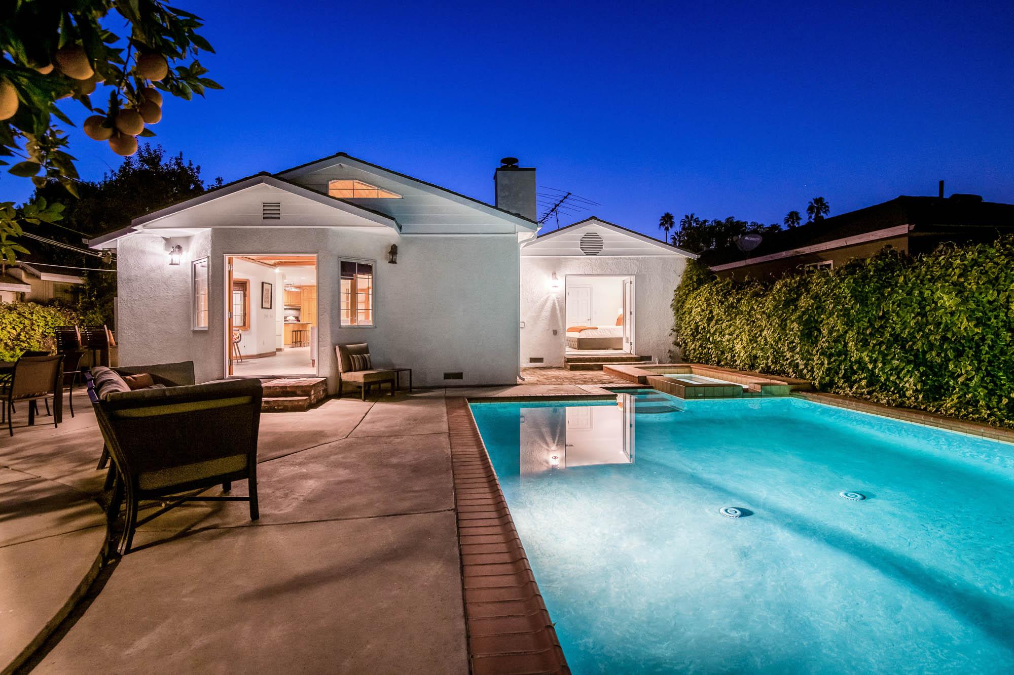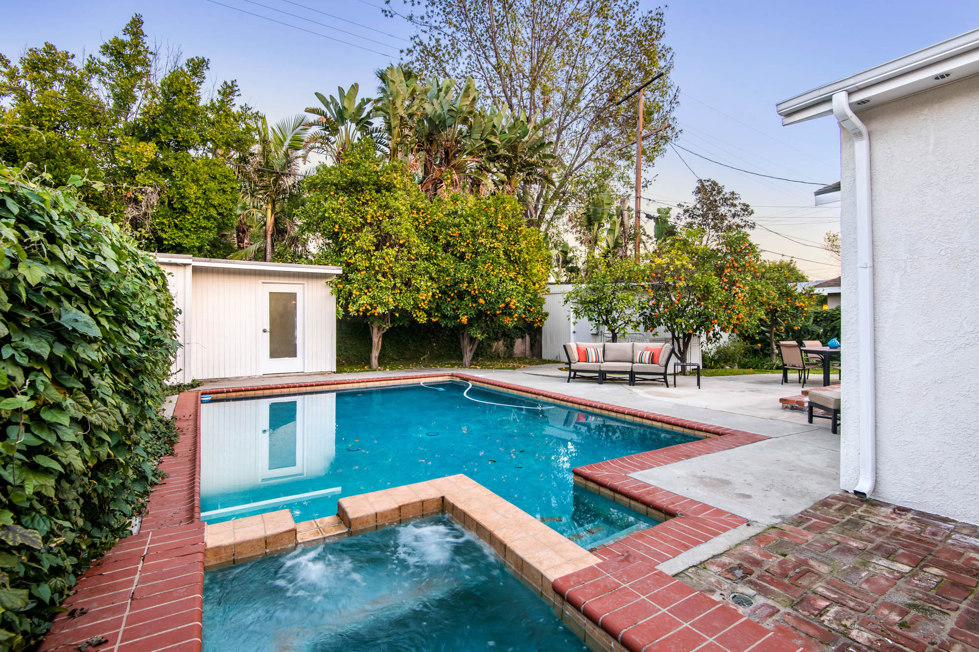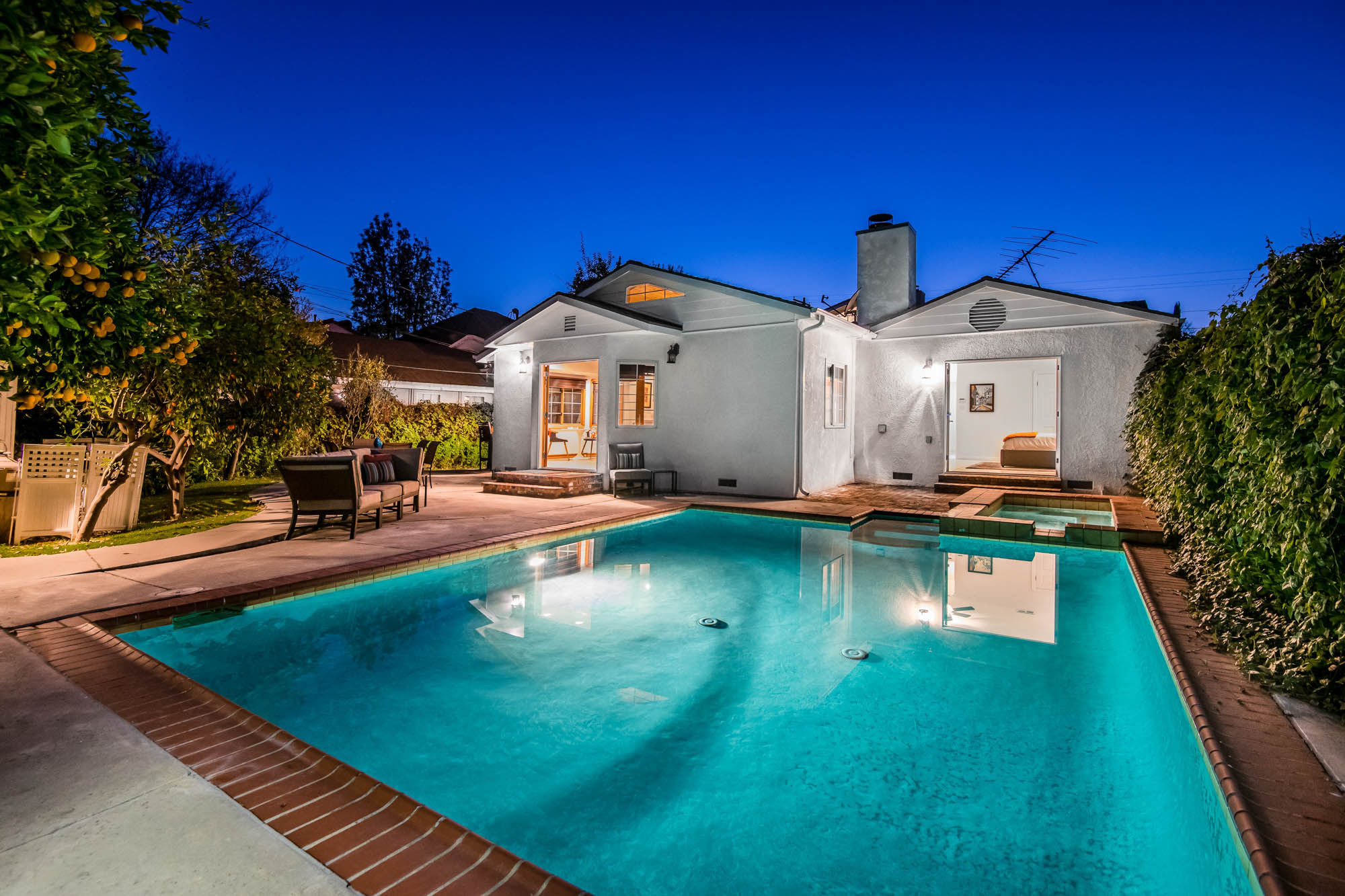 Welcome home to your 4 bedroom, 3 bathroom house in Valley Glen. Upon entering you’re greeted by a formal living room with floor to ceiling built-ins surrounding the stone fireplace. High ceilings and custom window treatments bring in an abundance of natural light. Down the hall from the living room, you’ll pass the first bedroom, bathroom, and enter into your spacious kitchen. With plenty of cabinetry, a pantry, and a large center island, this kitchen is perfect for all of your meal preparations. Off of the kitchen is the large family room. Beamed ceilings, windows, and french doors to the backyard make this a great open space for entertaining. The high ceilings continue into the formal dining room which also features a skylight and french doors. The master suite encompasses his and hers closets, a fireplace, and a private bathroom with a walk in shower. French doors in your master suite open to the backyard and provide amazing morning views of the pool. The home is complete with two more bedrooms and an additional bathroom. The backyard is a great place to gather friends and family for celebrations by the pool. A large patio with a built-in bbq completes the outdoor living experience. Two detached structures in the backyard provide extra storage and could be transformed into an office or hang out space. Additional features include mature fruit trees, control over the pool and spa from your phone or tablet, two car garage, and side by side washer and dryer.