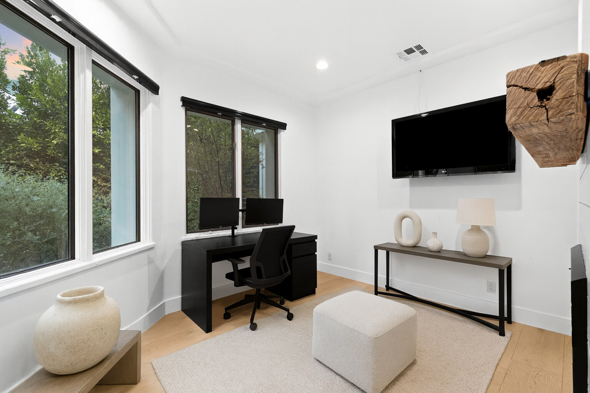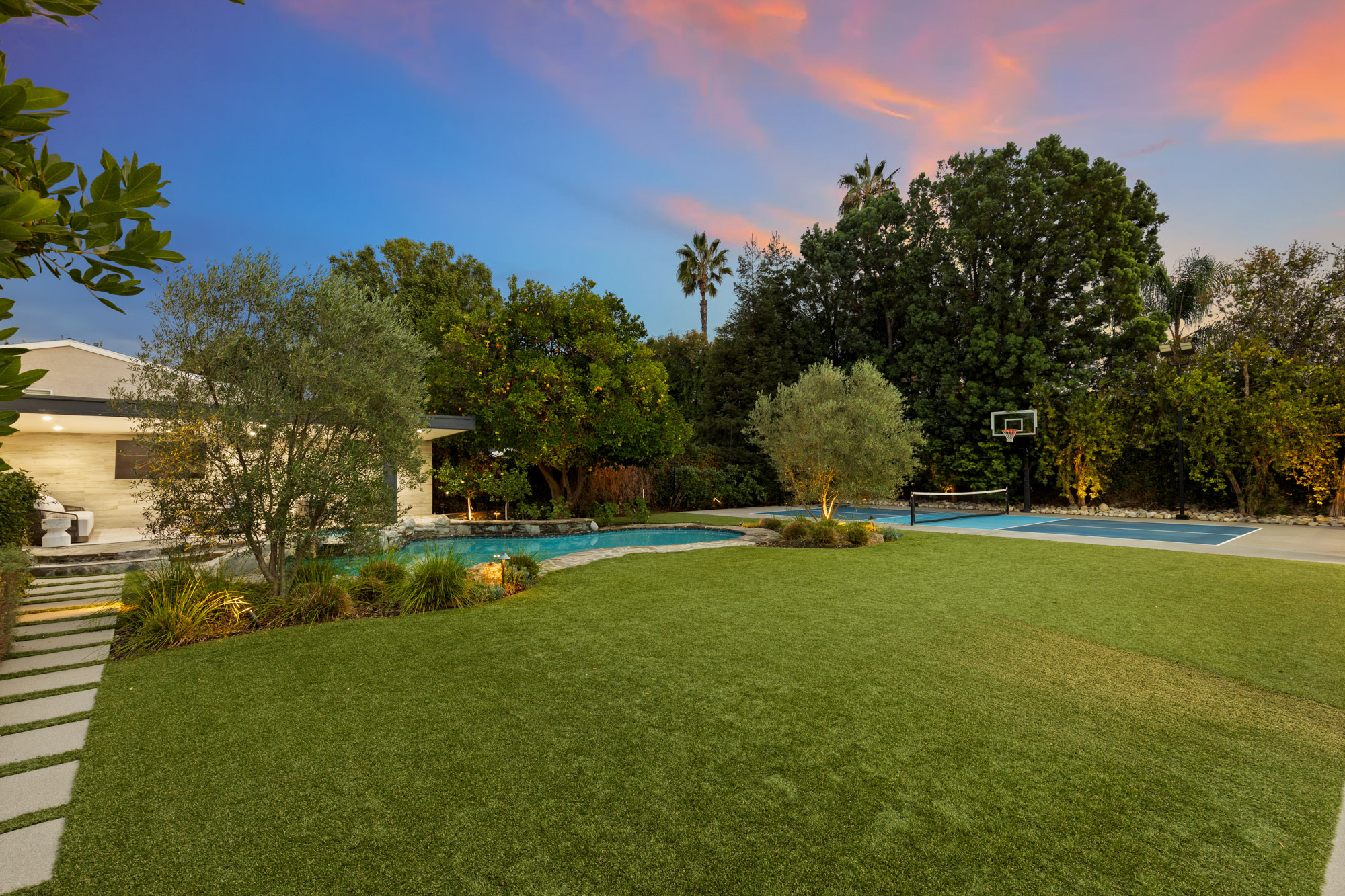 Welcome to this beautifully updated home, set on a sprawling .42 acre dual-gated lot in the highly sought-after Walnut Acres neighborhood of Woodland Hills. An expansive, landscaped front yard and generous setback provide exceptional privacy and a grand approach to the home, enhanced by towering mature hedges and privacy landscaping surrounding the property that create a private, estate-like setting. Double doors open to a grand foyer with soaring double-height ceilings that flow seamlessly into a spacious family room. Anchored by a stunning fireplace, the family room opens to a designer chef’s kitchen featuring top-of-the-line appliances, a massive island with seating and sun-drenched breakfast nook. The main living area also offers an inviting formal living and dining room, perfect for hosting holiday gatherings or intimate dinner parties. French doors open to a private backyard retreat designed for effortless entertaining. Surrounded by lush, mature landscaping, the outdoor space boasts a sparkling pool/spa, poolside cabana with a built-in firepit and outdoor TV, a sports court and outdoor BBQ with bar seating. Spread throughout the home are five generously sized bedrooms along with five full bathrooms, including an expansive primary suite highlighted by a private balcony that overlooks the backyard, dual walk-in closets and a spa-inspired bathroom, complete with a soaking tub, oversized walk-in shower and double vanity. Additional amenities include a large attic for extra storage, three-car garage and private dual-gated circular driveway. This property is conveniently located nearby Westfield Topanga Mall, Topanga Village, Warner Center, Ventura Boulevard and so much more. Lease includes pool and landscaping services, and is available partially or fully furnished.