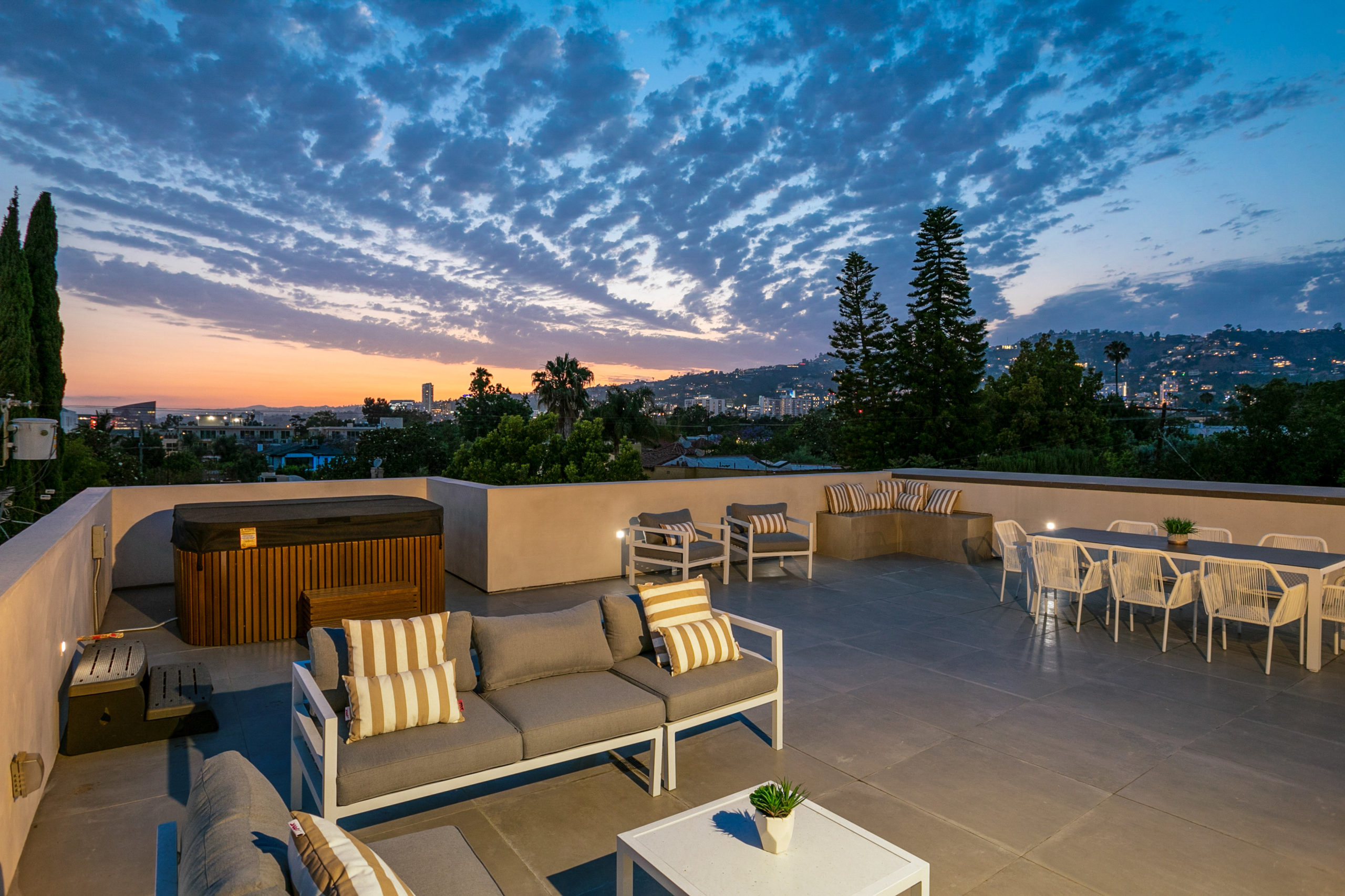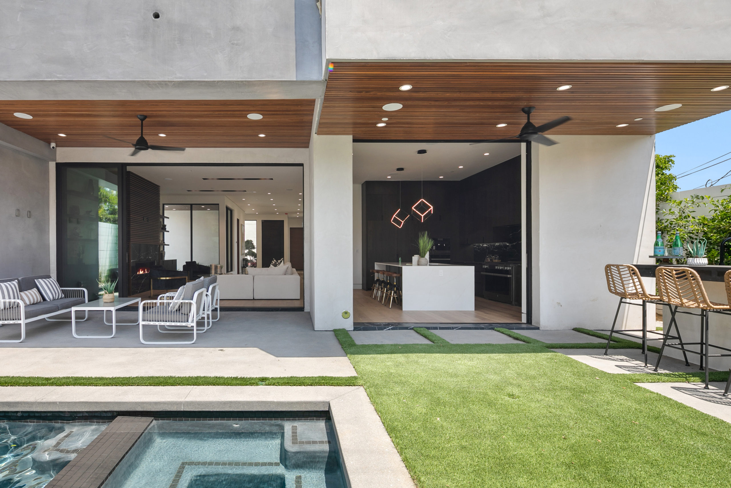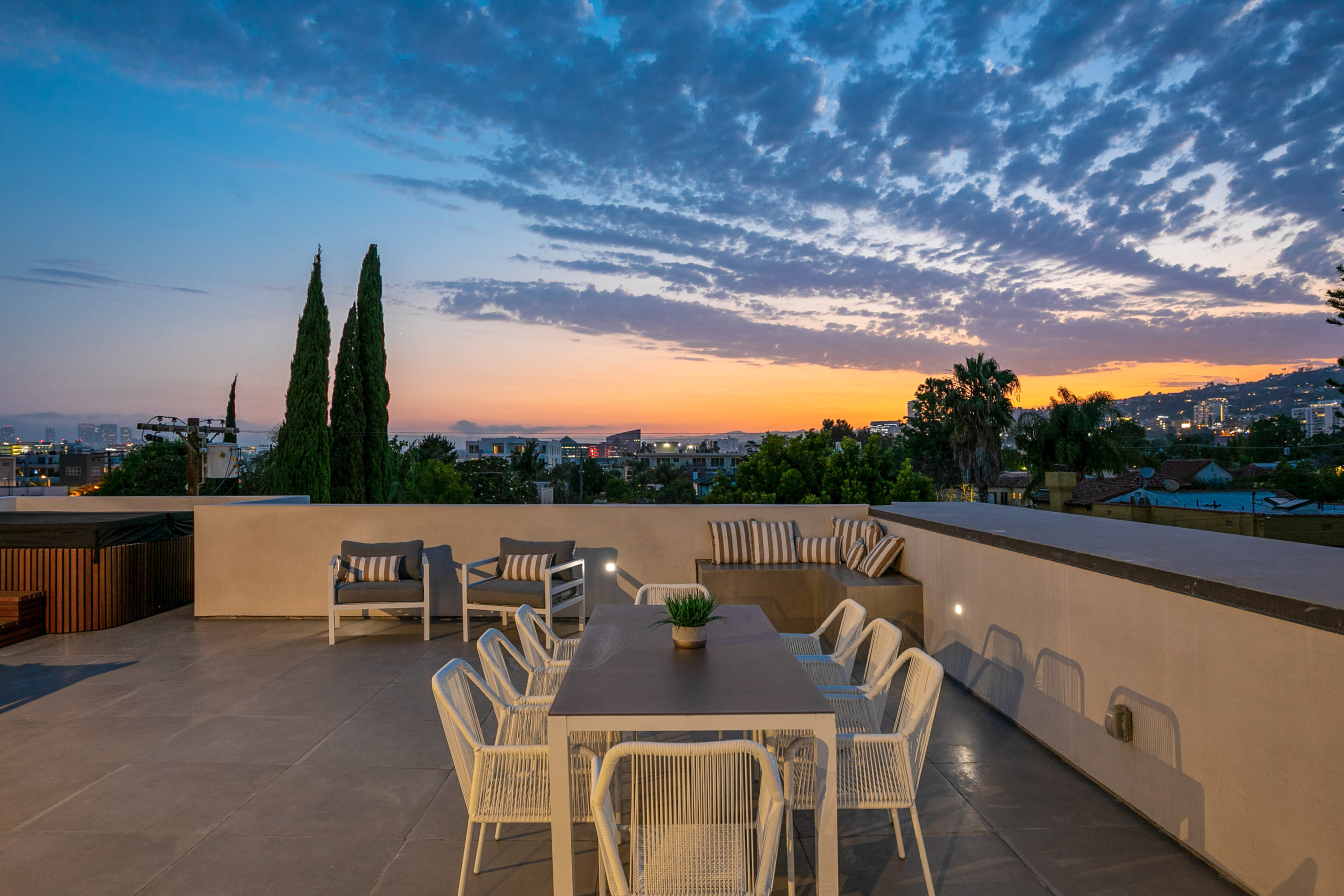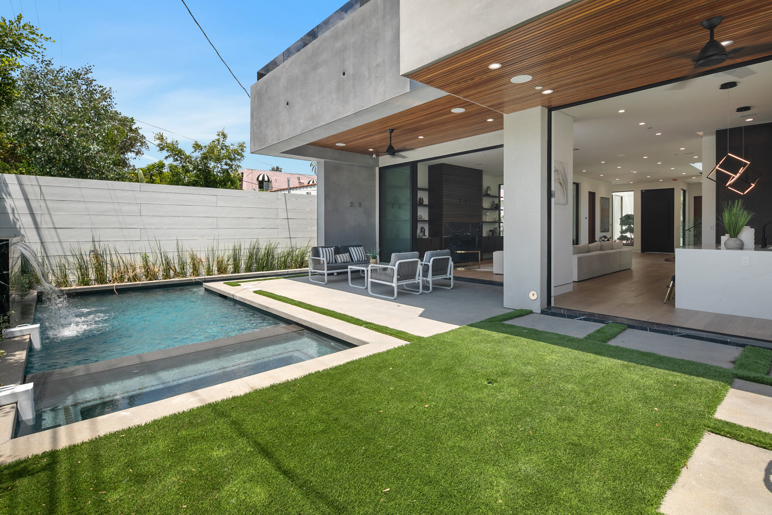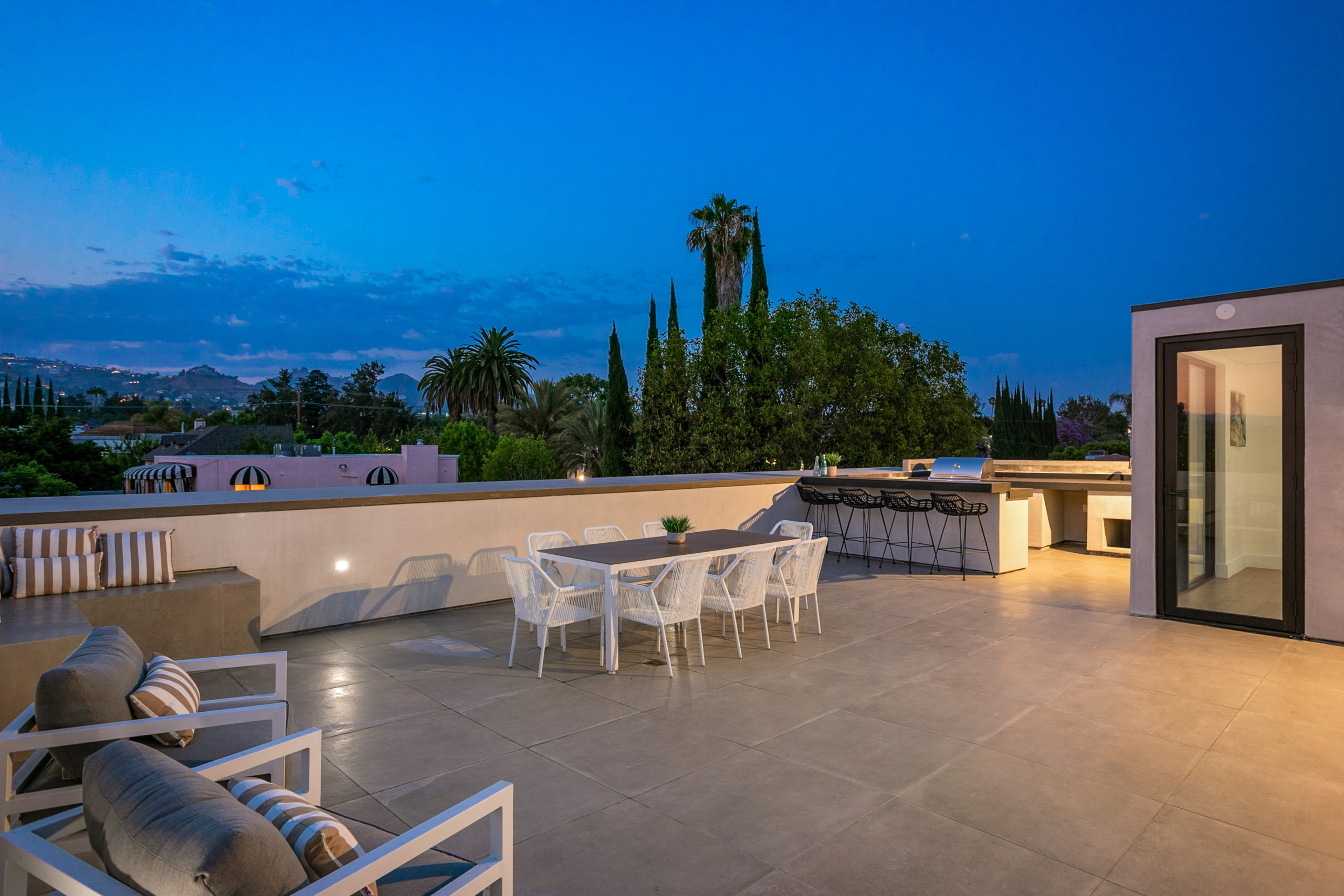 THE CROWN JEWEL OF BEVERLY GROVE! An ultimate modern find in L. A's hottest enclave offers a sweeping open floorplan with a grand entrance, accompanied by a contemporary foyer that leads to the oak wood finished first floor which features a theater, office, dining room and a gourmet kitchen with Miele appliances overlooking the fire lit living room with disappearing floor to ceiling glass doors welcoming you to the manicured private backyard with an outdoor kitchen, lounge area, wraparound pool/spa and a waterfall. Second floor holds a pristine master suite partnered by a luxurious bathroom, designer walk-in closet and a back terrace. Neighboring the master, lay 3 sizeable en suites and a laundry room. Making your way up the floating stairs, stages an entertainers rooftop deck with panoramic views, BBQ Island, and a freestanding jacuzzi. This exquisite new construction modern gem is a great home for the most discerning buyers.