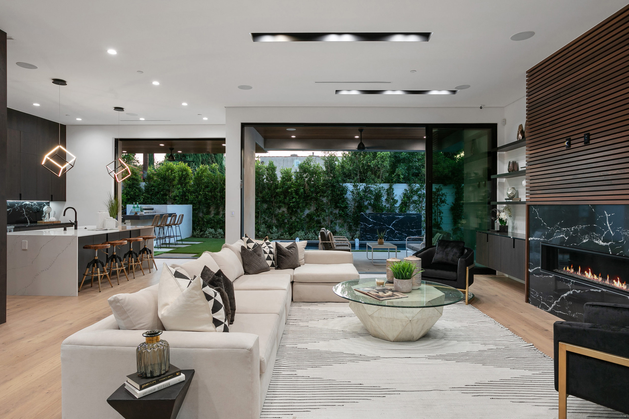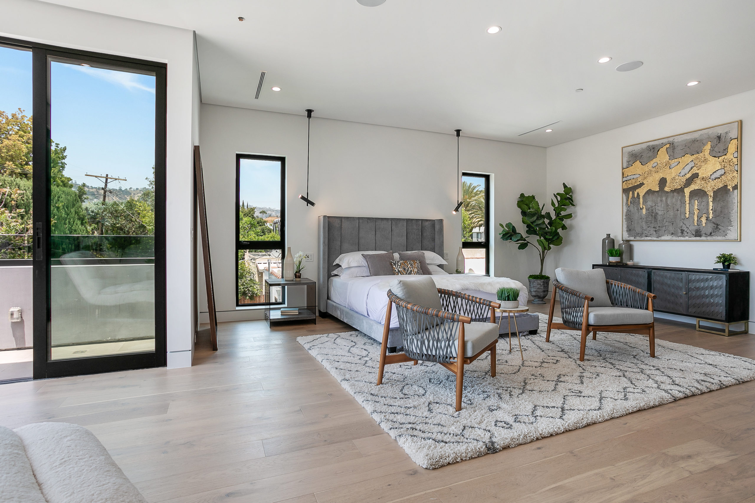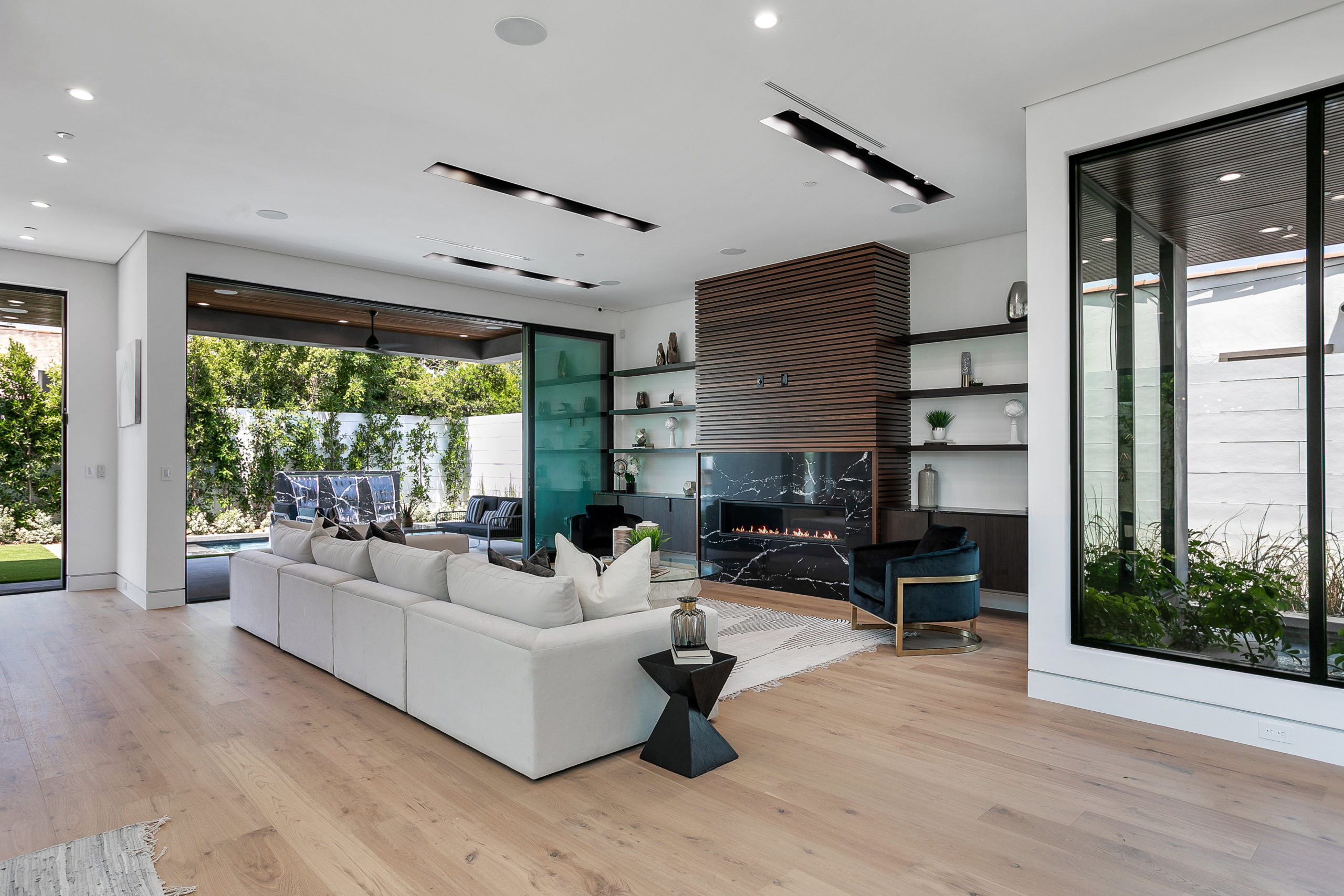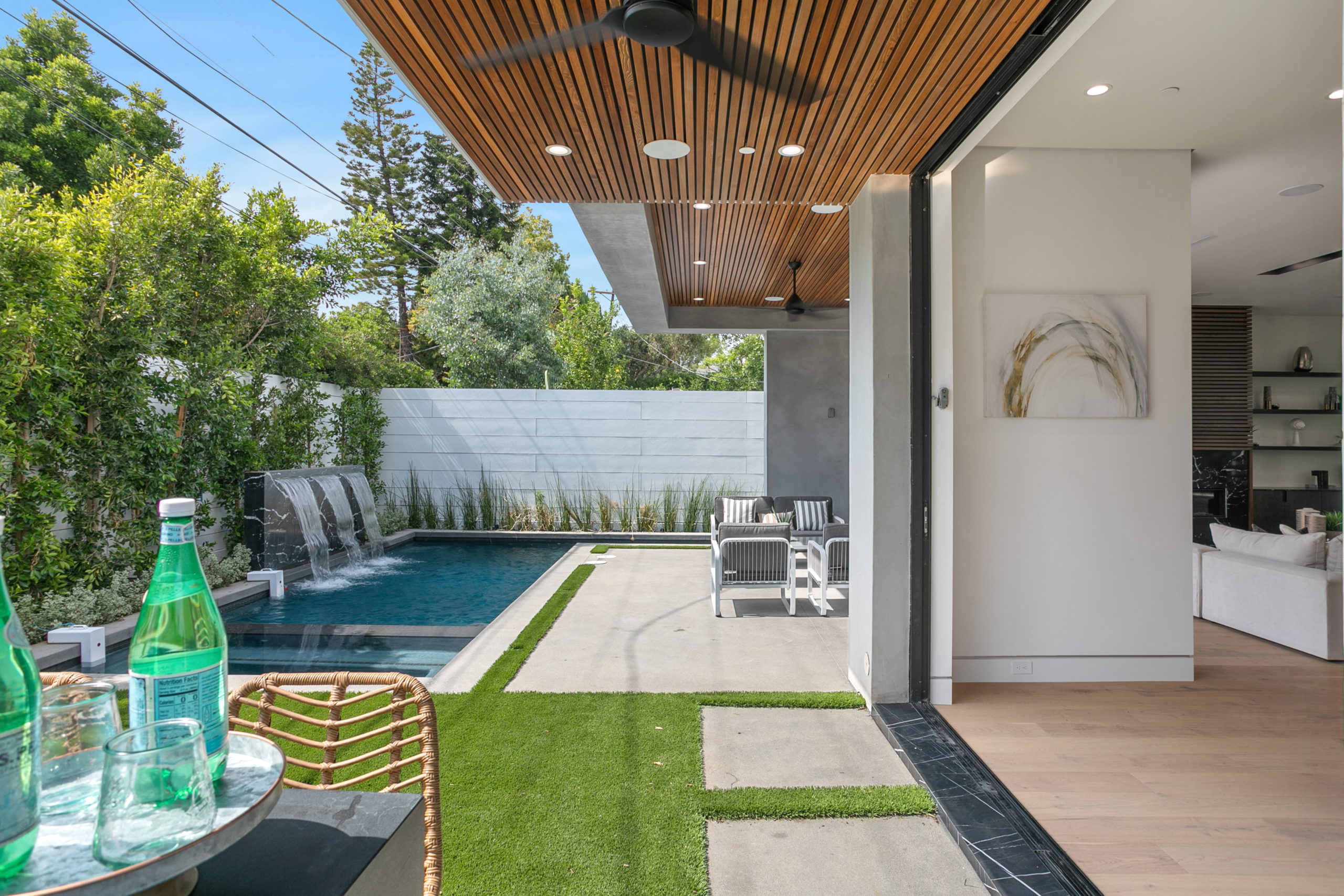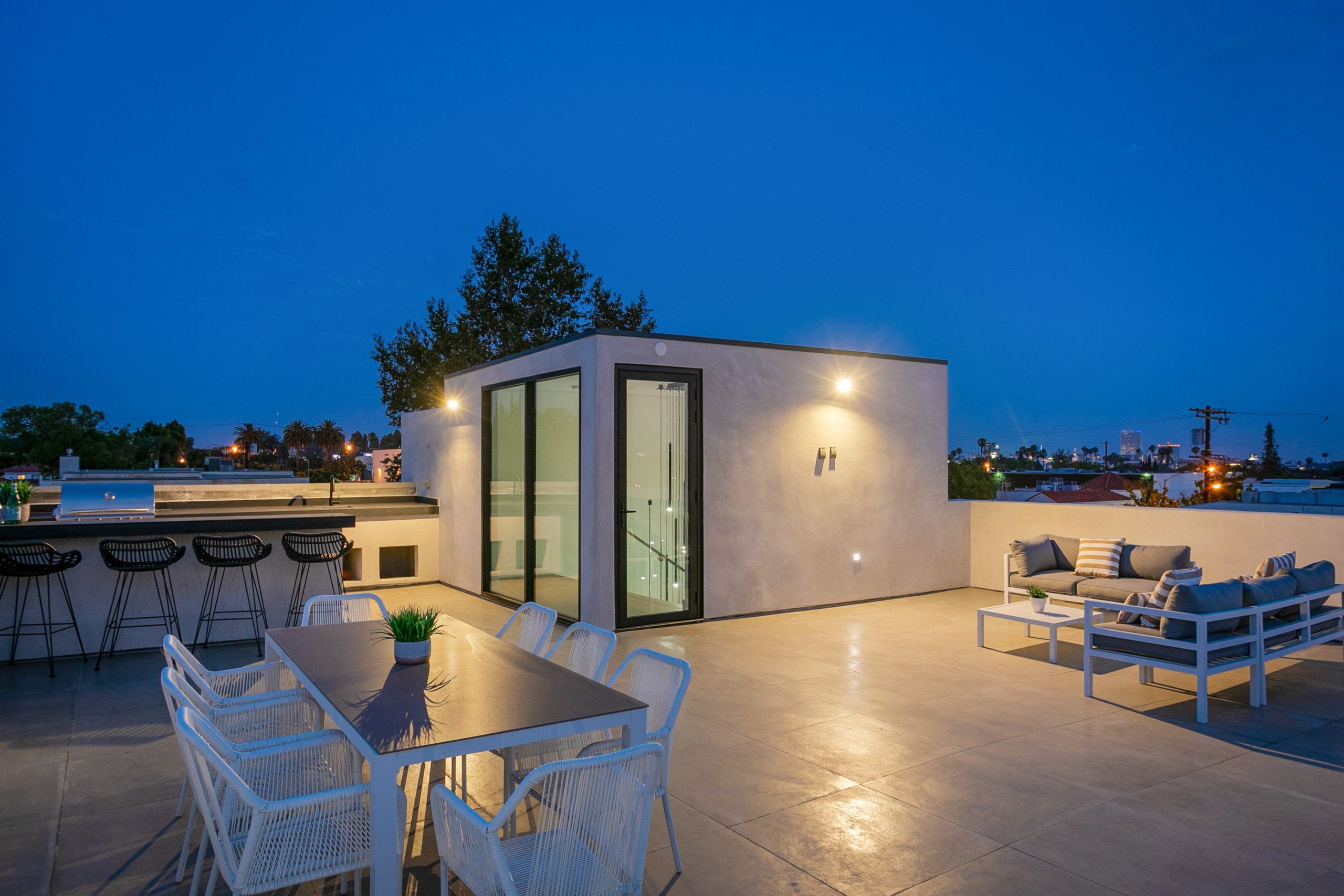 THE CROWN JEWEL OF BEVERLY GROVE! An ultimate modern find in L. A's hottest enclave offers a sweeping open floorplan with a grand entrance, accompanied by a contemporary foyer that leads to the oak wood finished first floor which features a theater, office, dining room and a gourmet kitchen with Miele appliances overlooking the fire lit living room with disappearing floor to ceiling glass doors welcoming you to the manicured private backyard with an outdoor kitchen, lounge area, wraparound pool/spa and a waterfall. Second floor holds a pristine master suite partnered by a luxurious bathroom, designer walk-in closet and a back terrace. Neighboring the master, lay 3 sizeable en suites and a laundry room. Making your way up the floating stairs, stages an entertainers rooftop deck with panoramic views, BBQ Island, and a freestanding jacuzzi. This exquisite new construction modern gem is a great home for the most discerning buyers.