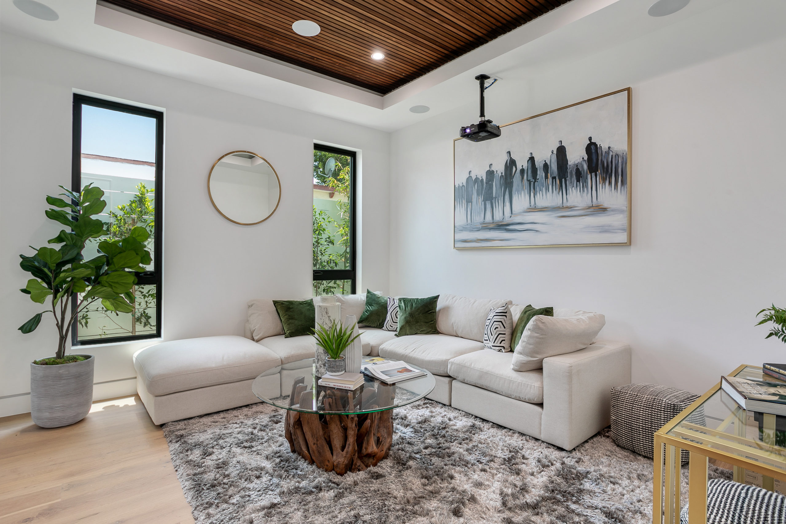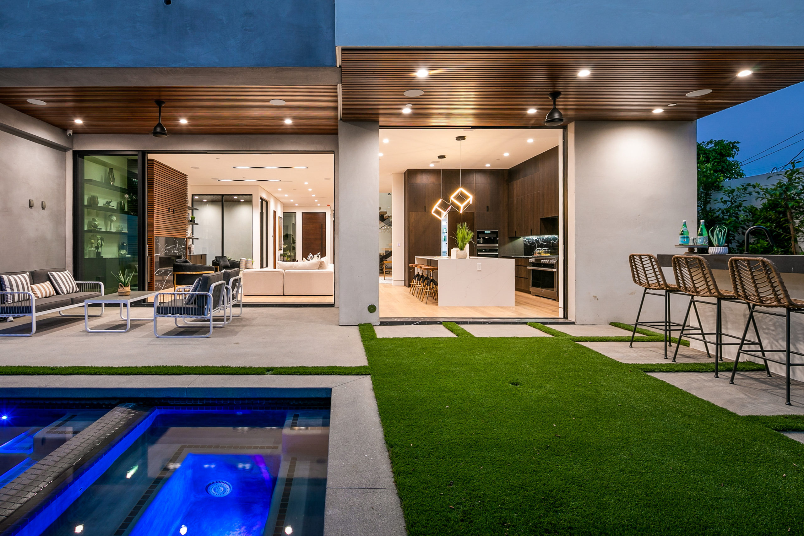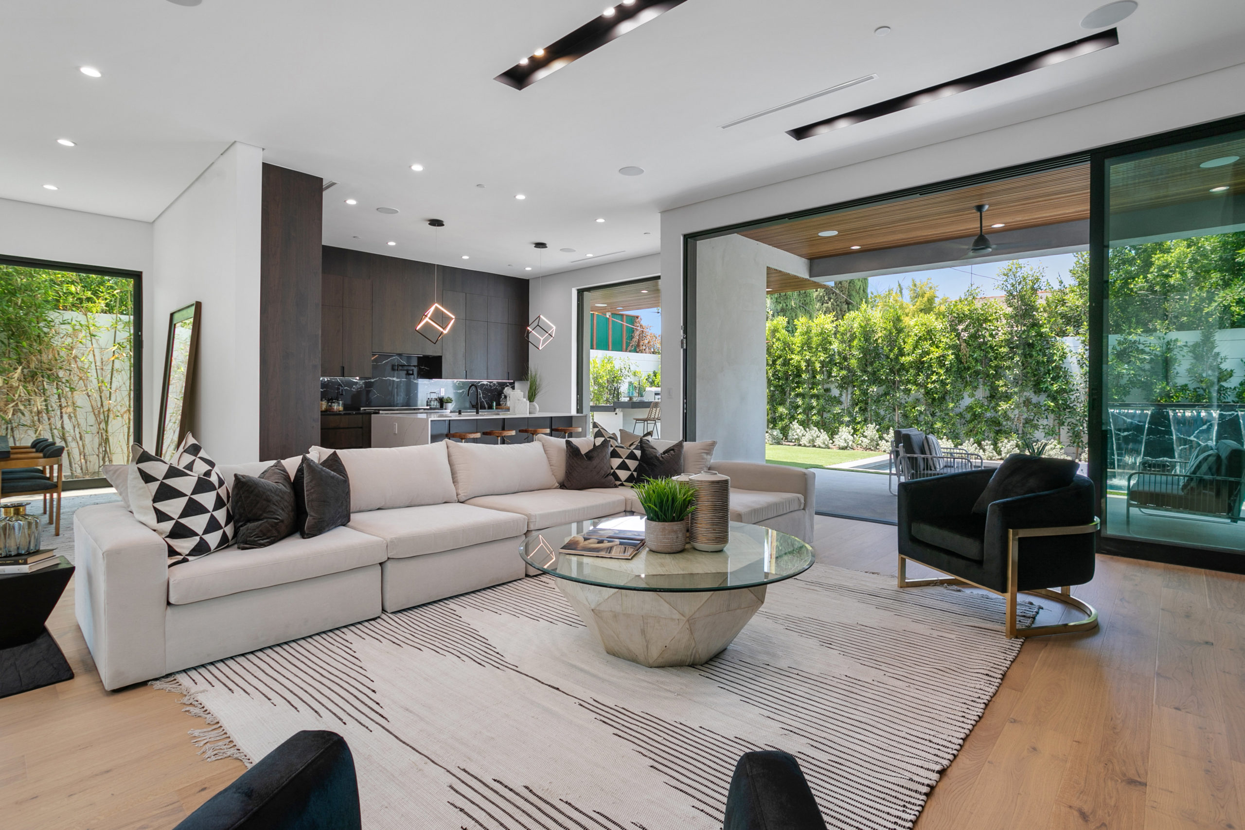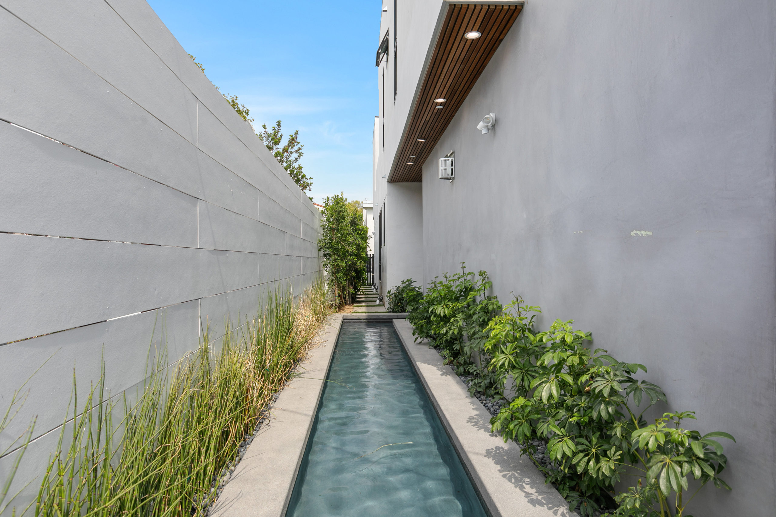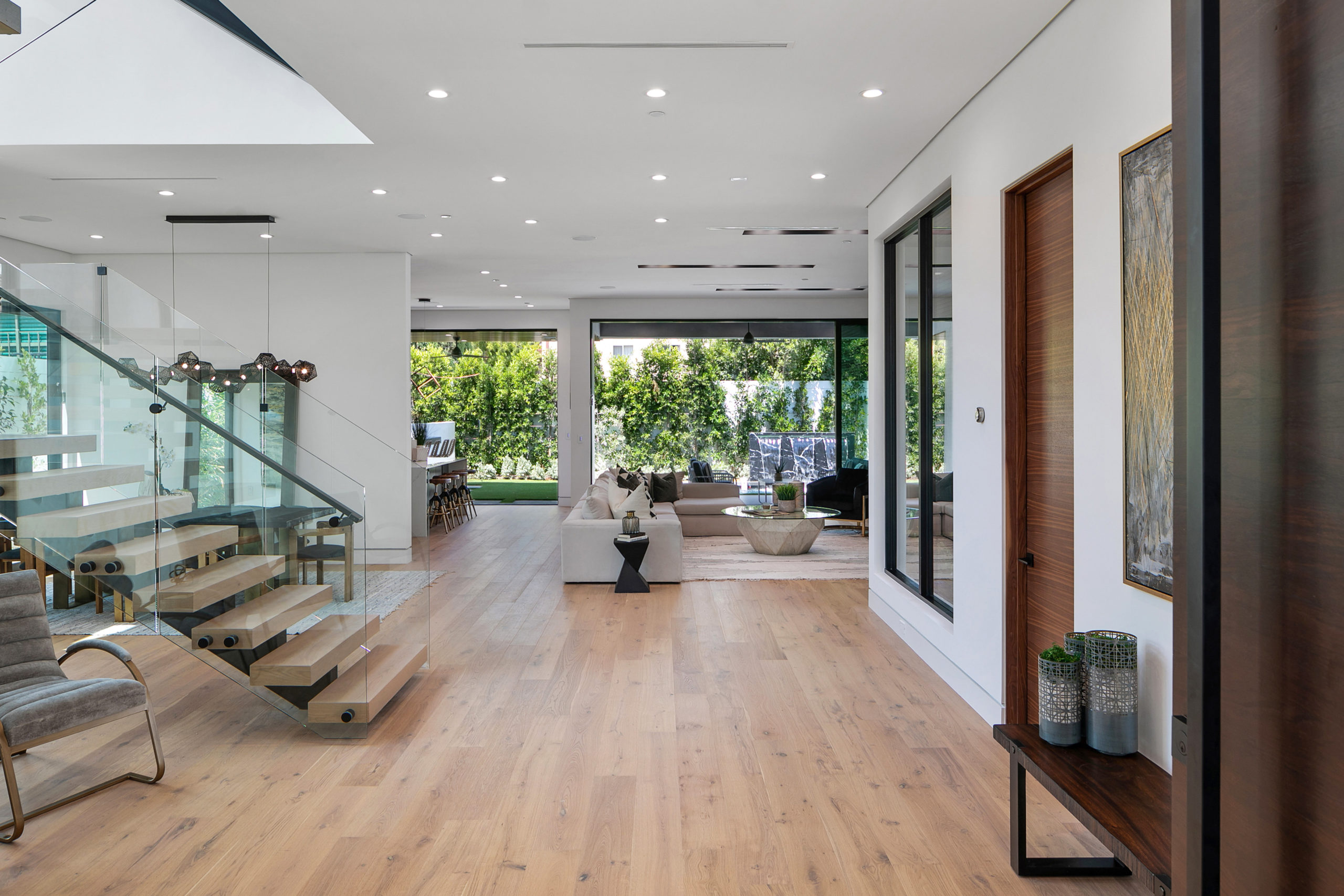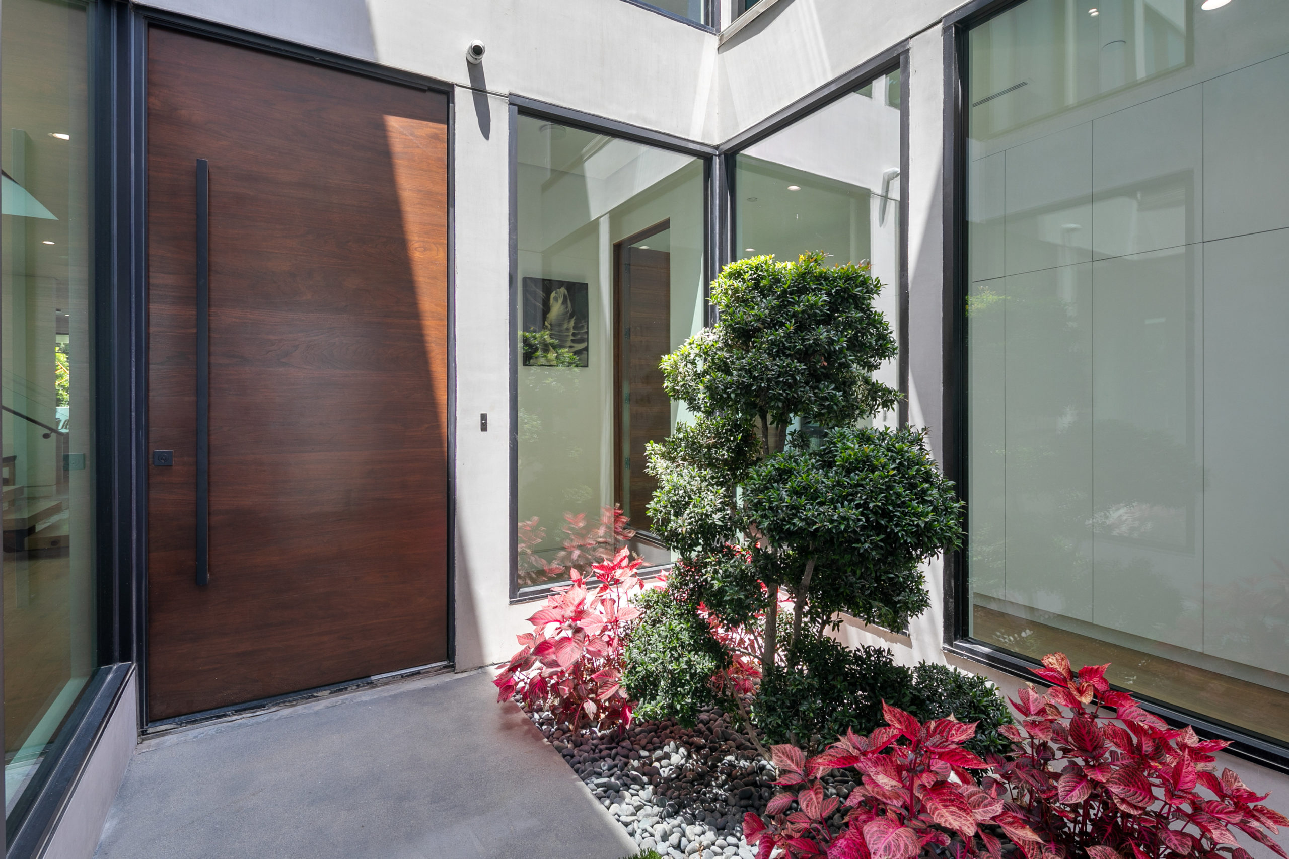 THE CROWN JEWEL OF BEVERLY GROVE! An ultimate modern find in L. A's hottest enclave offers a sweeping open floorplan with a grand entrance, accompanied by a contemporary foyer that leads to the oak wood finished first floor which features a theater, office, dining room and a gourmet kitchen with Miele appliances overlooking the fire lit living room with disappearing floor to ceiling glass doors welcoming you to the manicured private backyard with an outdoor kitchen, lounge area, wraparound pool/spa and a waterfall. Second floor holds a pristine master suite partnered by a luxurious bathroom, designer walk-in closet and a back terrace. Neighboring the master, lay 3 sizeable en suites and a laundry room. Making your way up the floating stairs, stages an entertainers rooftop deck with panoramic views, BBQ Island, and a freestanding jacuzzi. This exquisite new construction modern gem is a great home for the most discerning buyers.