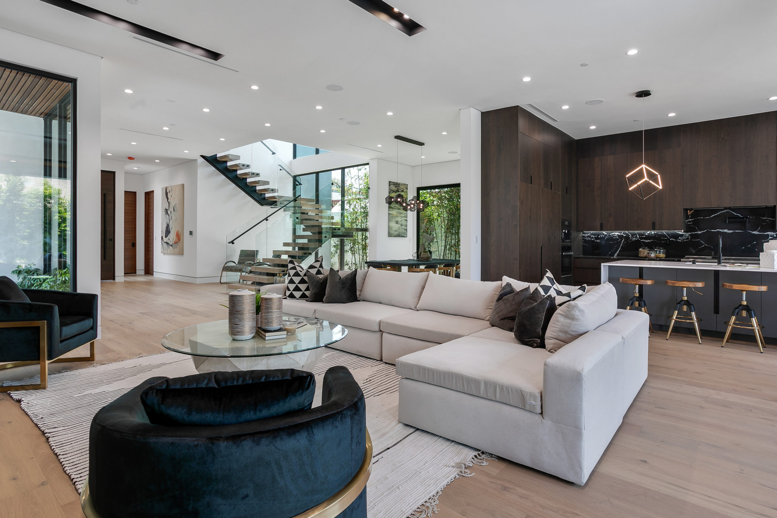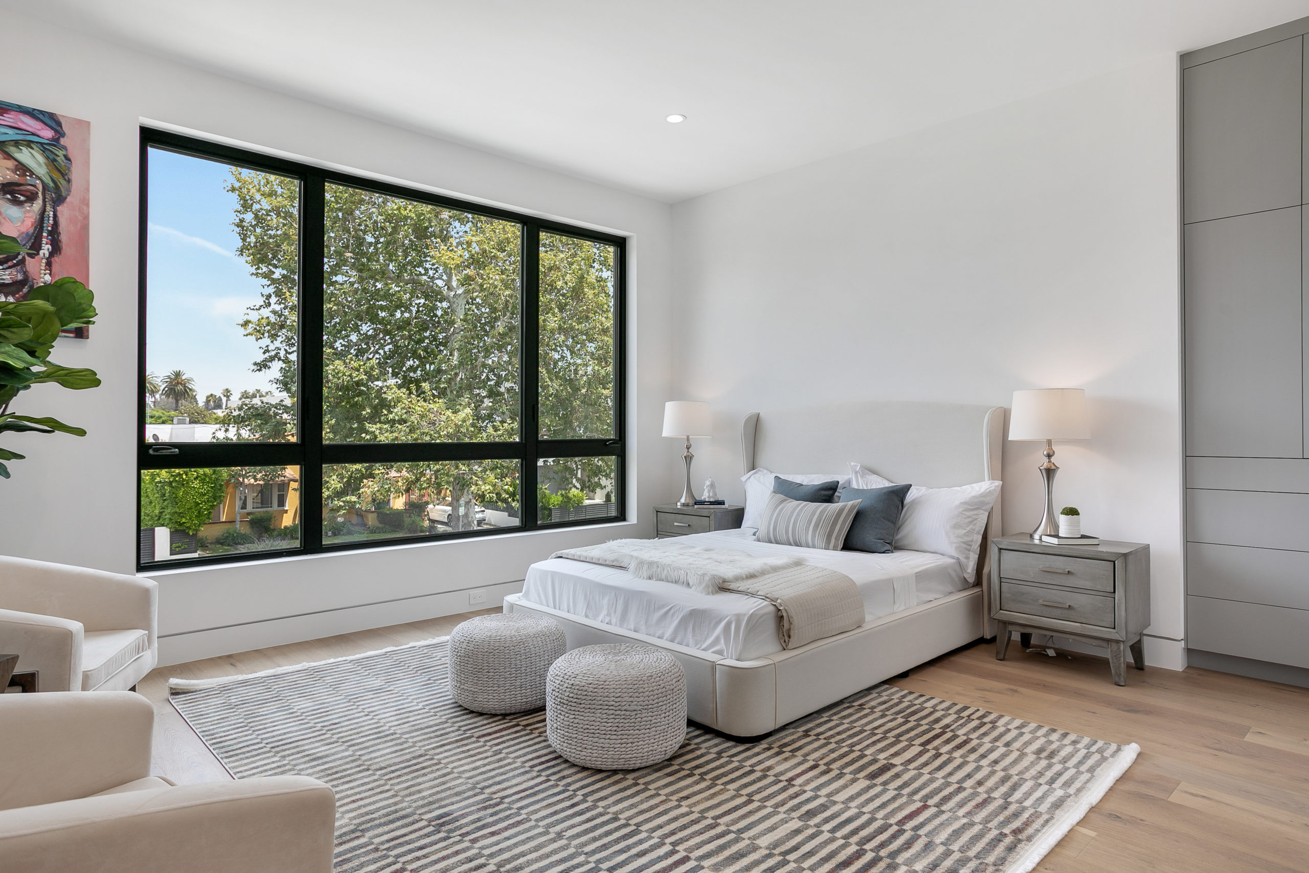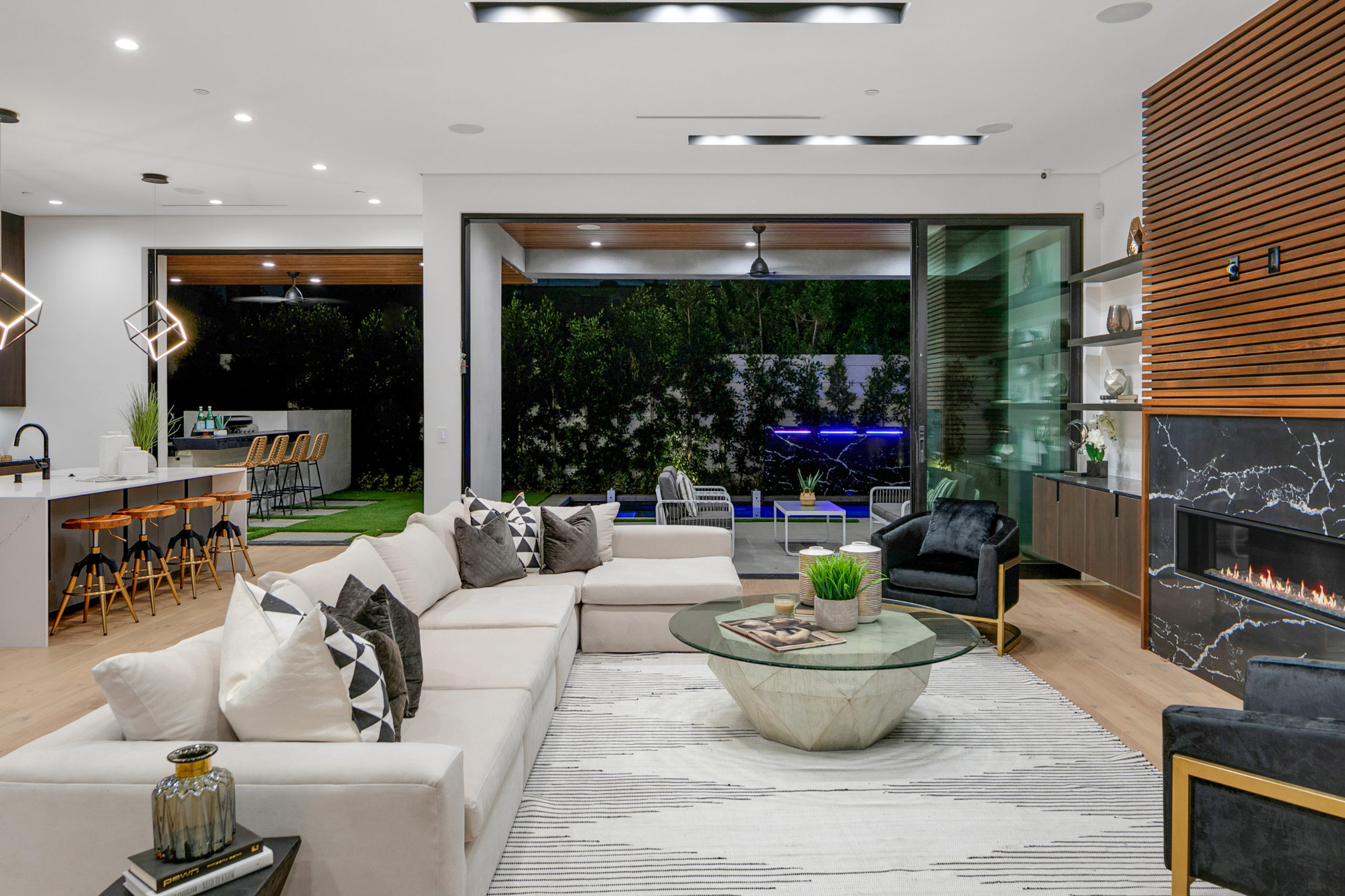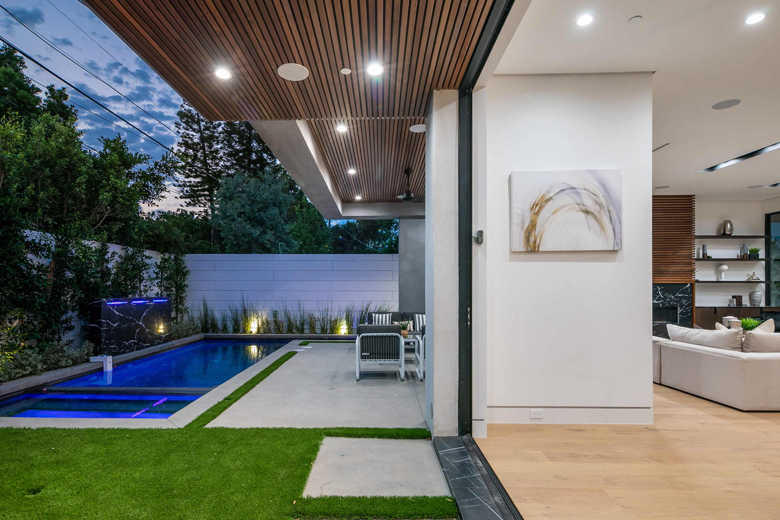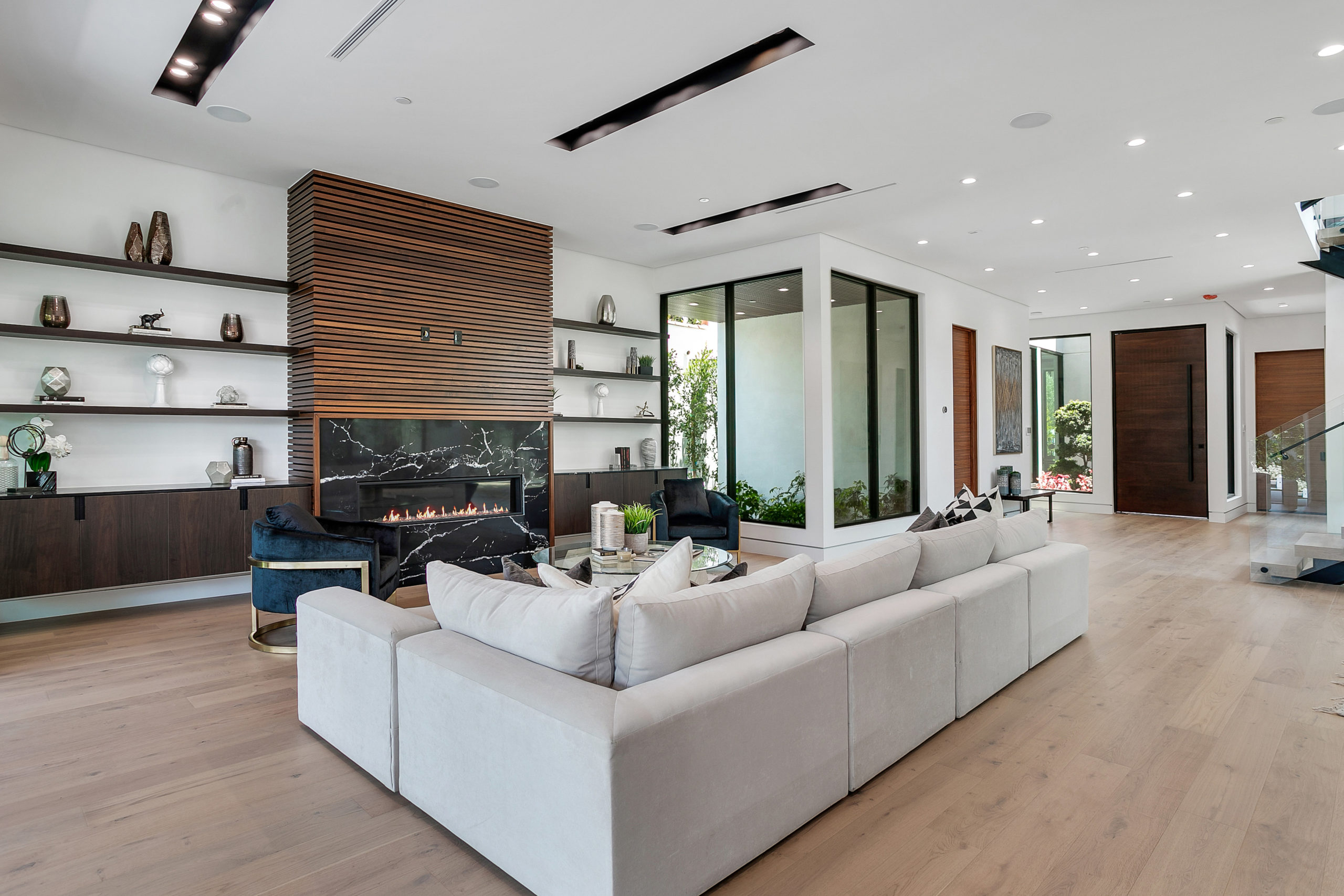 THE CROWN JEWEL OF BEVERLY GROVE! An ultimate modern find in L. A's hottest enclave offers a sweeping open floorplan with a grand entrance, accompanied by a contemporary foyer that leads to the oak wood finished first floor which features a theater, office, dining room and a gourmet kitchen with Miele appliances overlooking the fire lit living room with disappearing floor to ceiling glass doors welcoming you to the manicured private backyard with an outdoor kitchen, lounge area, wraparound pool/spa and a waterfall. Second floor holds a pristine master suite partnered by a luxurious bathroom, designer walk-in closet and a back terrace. Neighboring the master, lay 3 sizeable en suites and a laundry room. Making your way up the floating stairs, stages an entertainers rooftop deck with panoramic views, BBQ Island, and a freestanding jacuzzi. This exquisite new construction modern gem is a great home for the most discerning buyers.