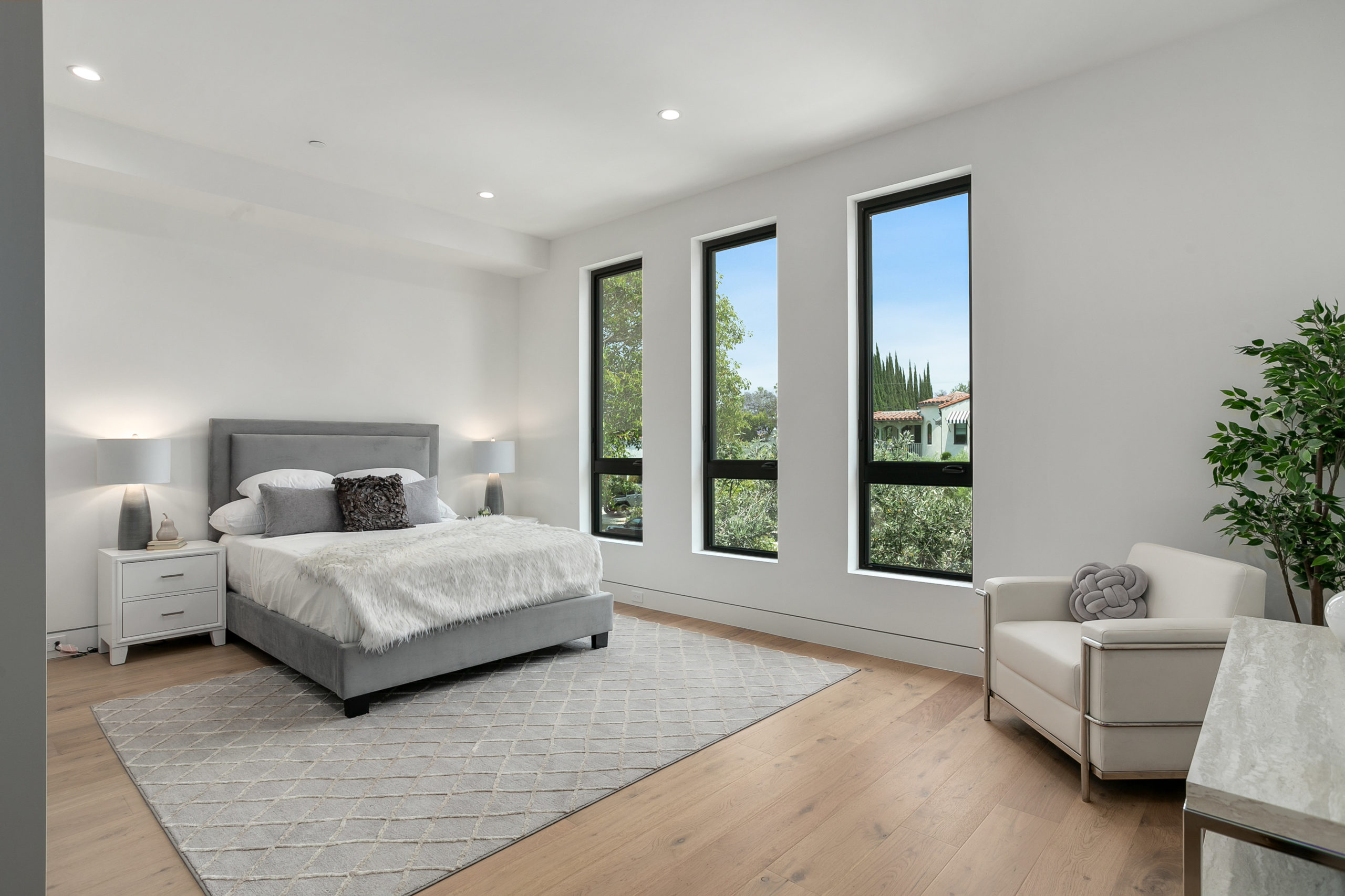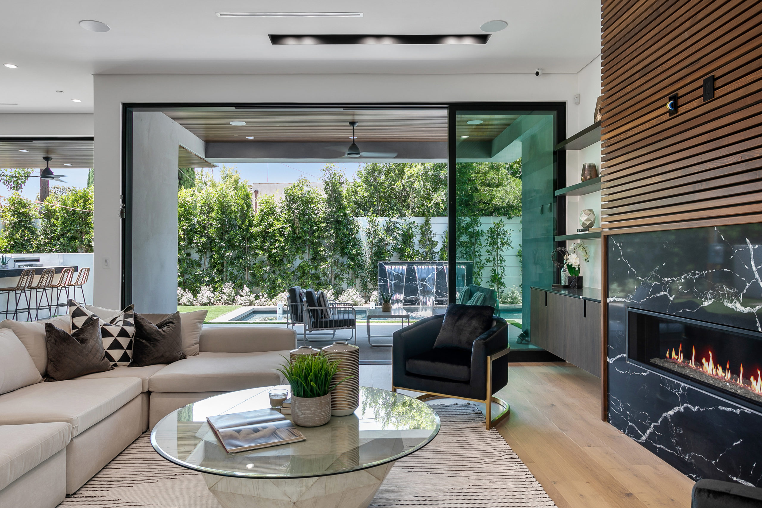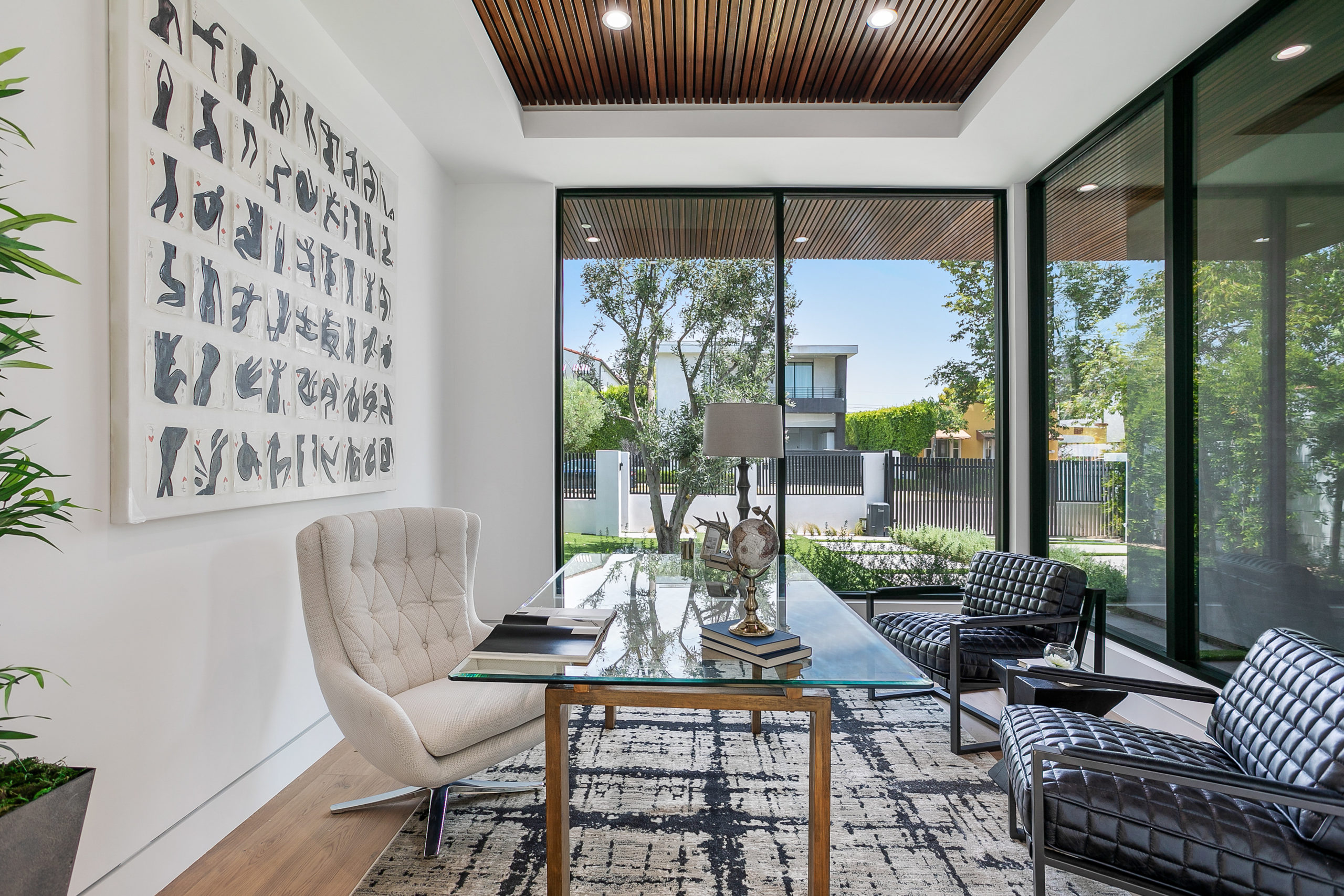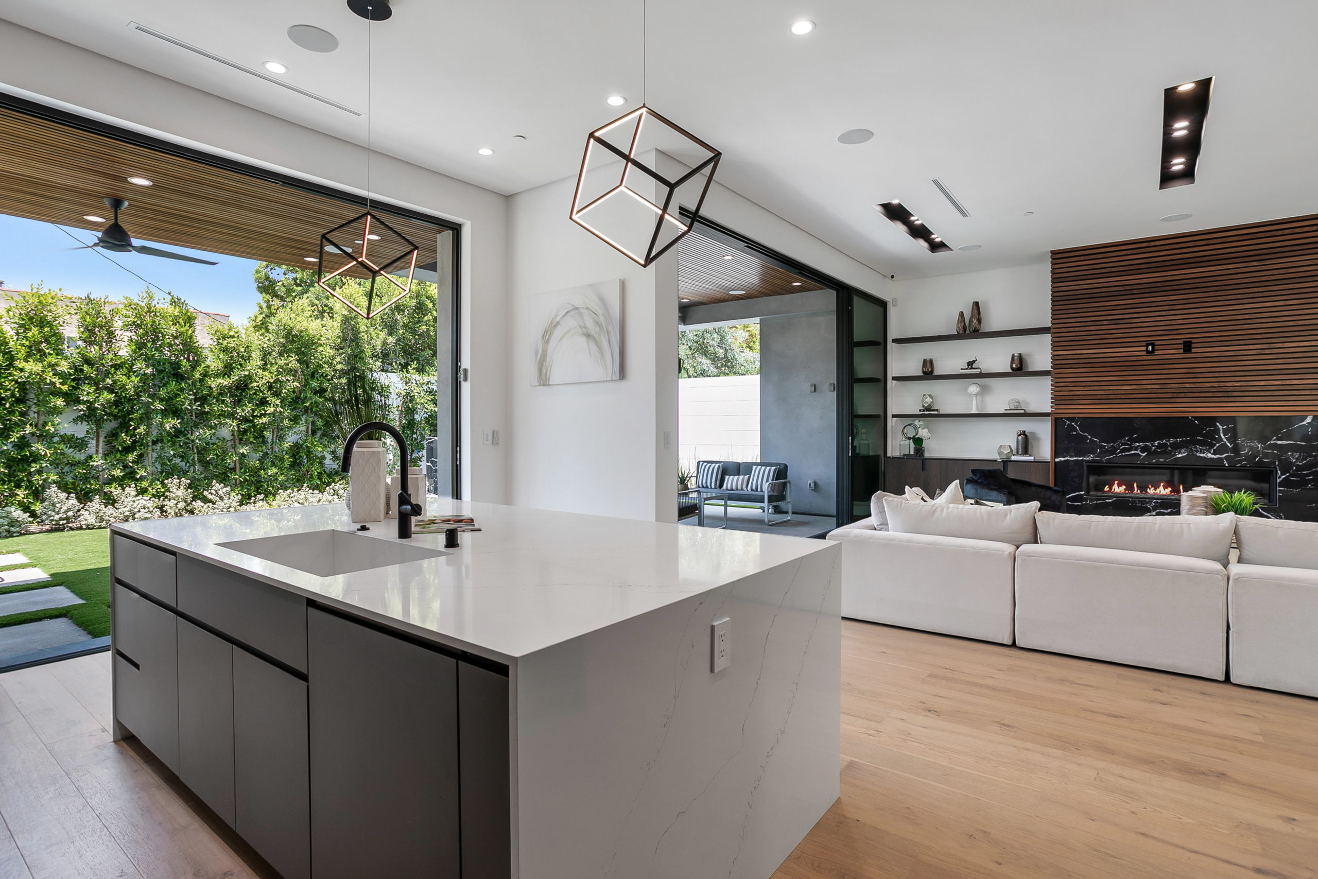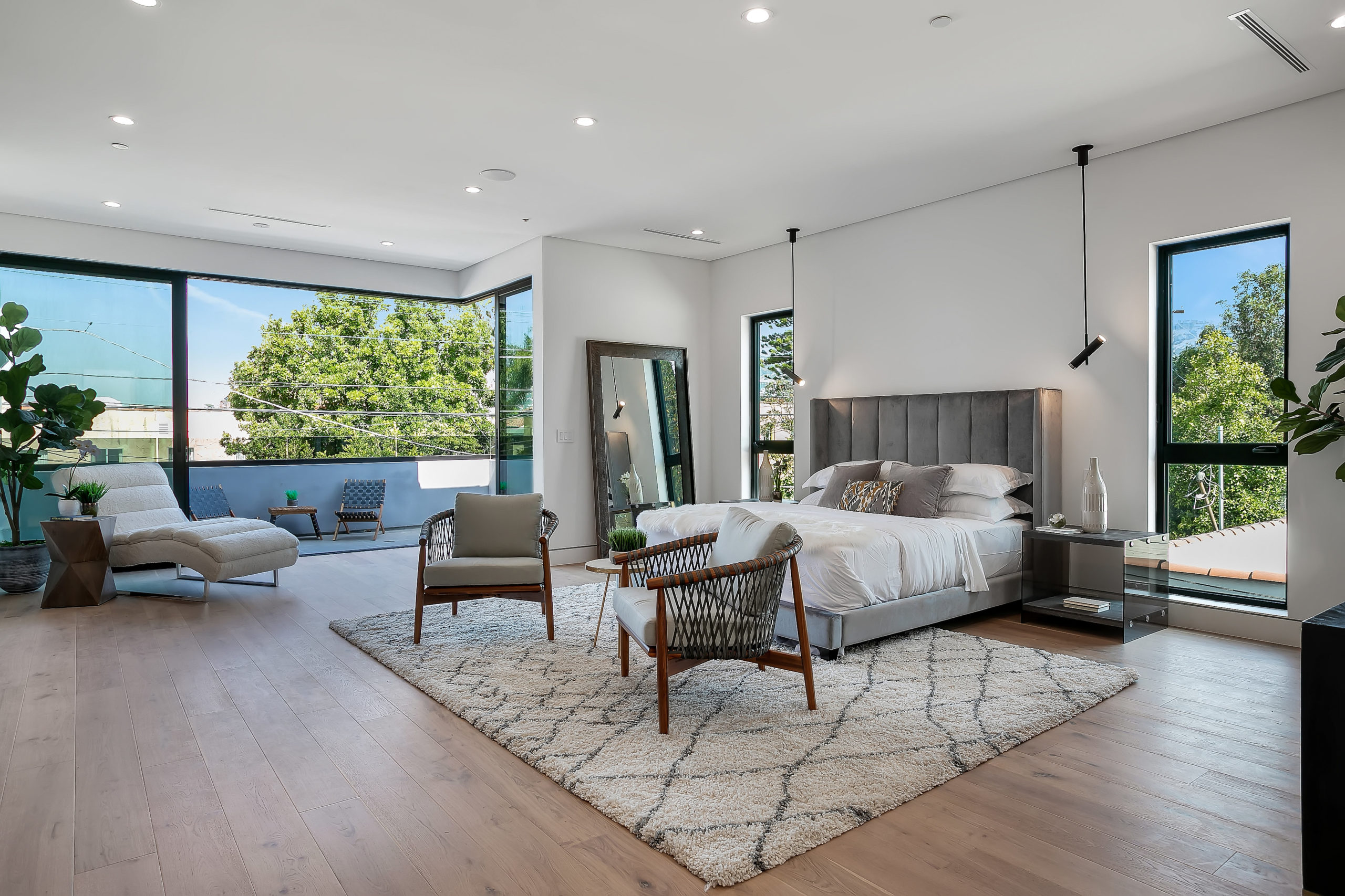 THE CROWN JEWEL OF BEVERLY GROVE! An ultimate modern find in L. A's hottest enclave offers a sweeping open floorplan with a grand entrance, accompanied by a contemporary foyer that leads to the oak wood finished first floor which features a theater, office, dining room and a gourmet kitchen with Miele appliances overlooking the fire lit living room with disappearing floor to ceiling glass doors welcoming you to the manicured private backyard with an outdoor kitchen, lounge area, wraparound pool/spa and a waterfall. Second floor holds a pristine master suite partnered by a luxurious bathroom, designer walk-in closet and a back terrace. Neighboring the master, lay 3 sizeable en suites and a laundry room. Making your way up the floating stairs, stages an entertainers rooftop deck with panoramic views, BBQ Island, and a freestanding jacuzzi. This exquisite new construction modern gem is a great home for the most discerning buyers.