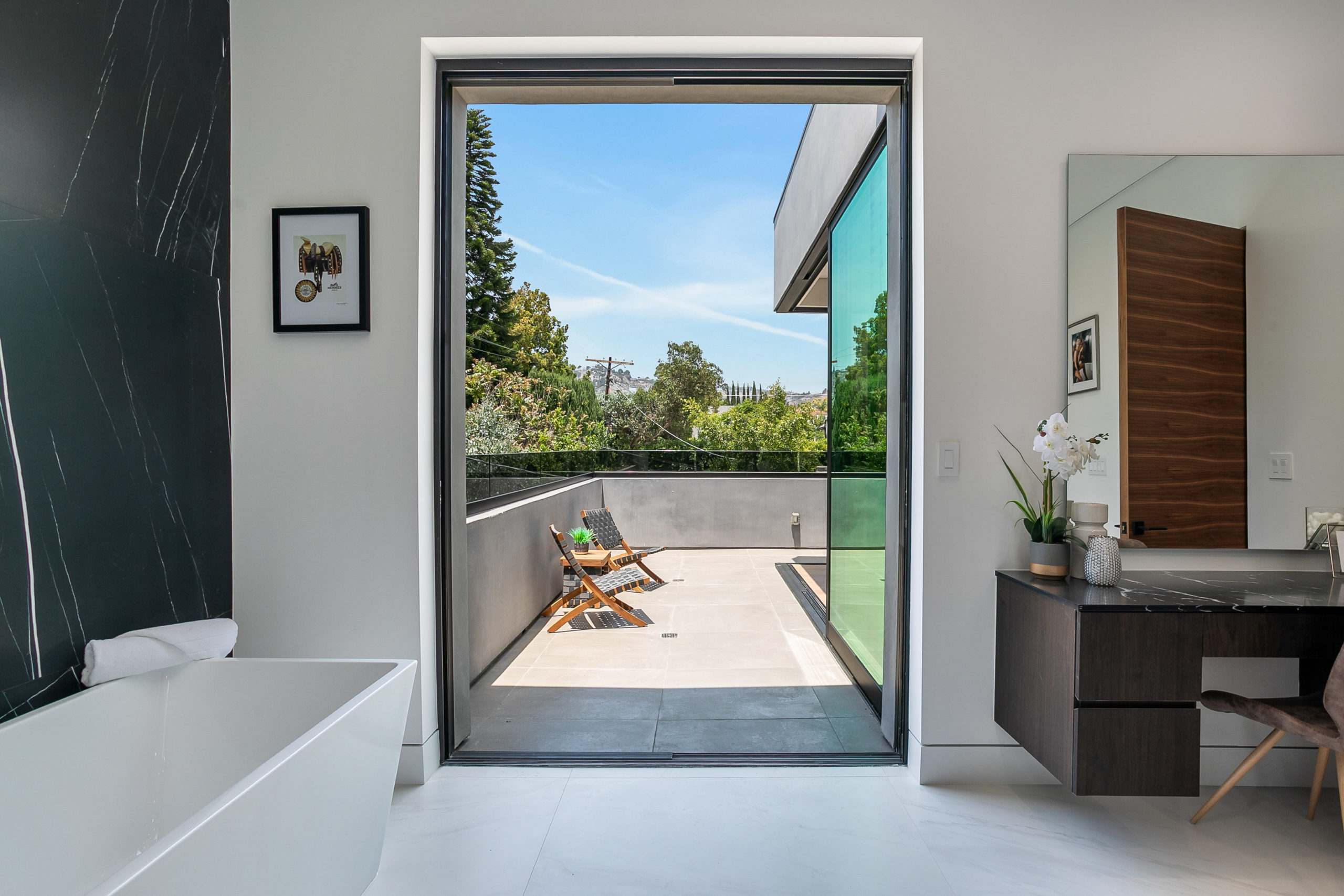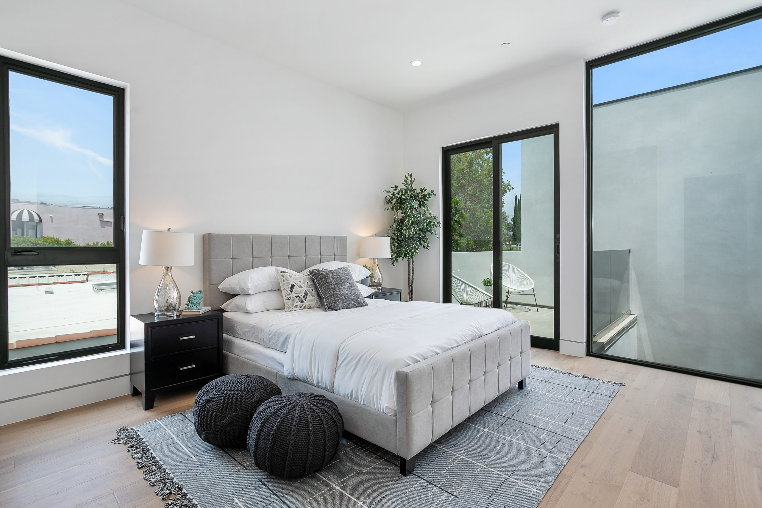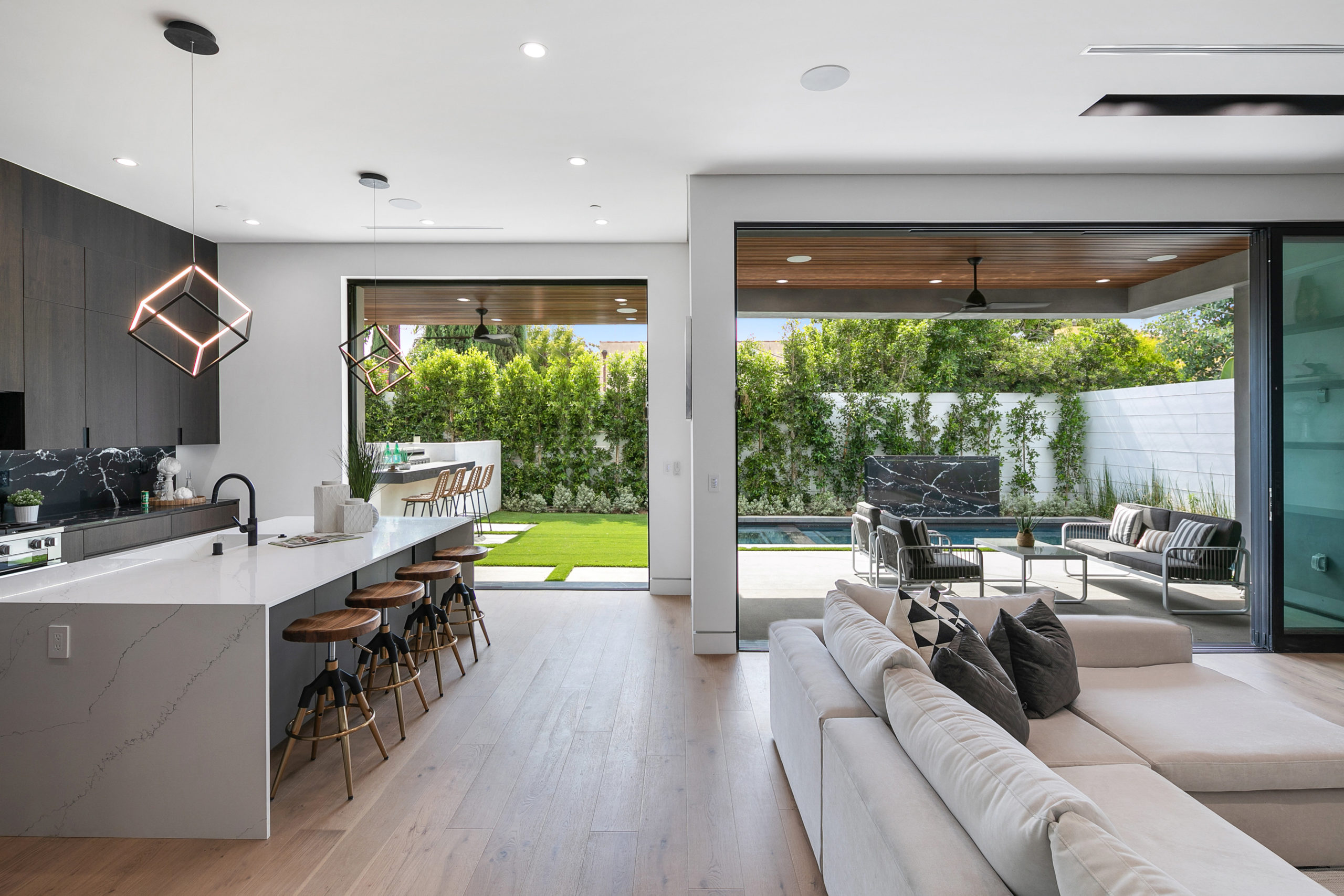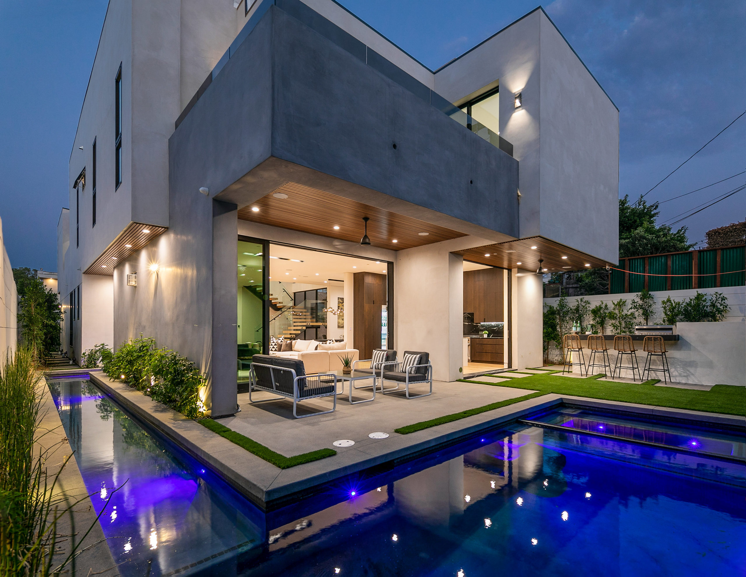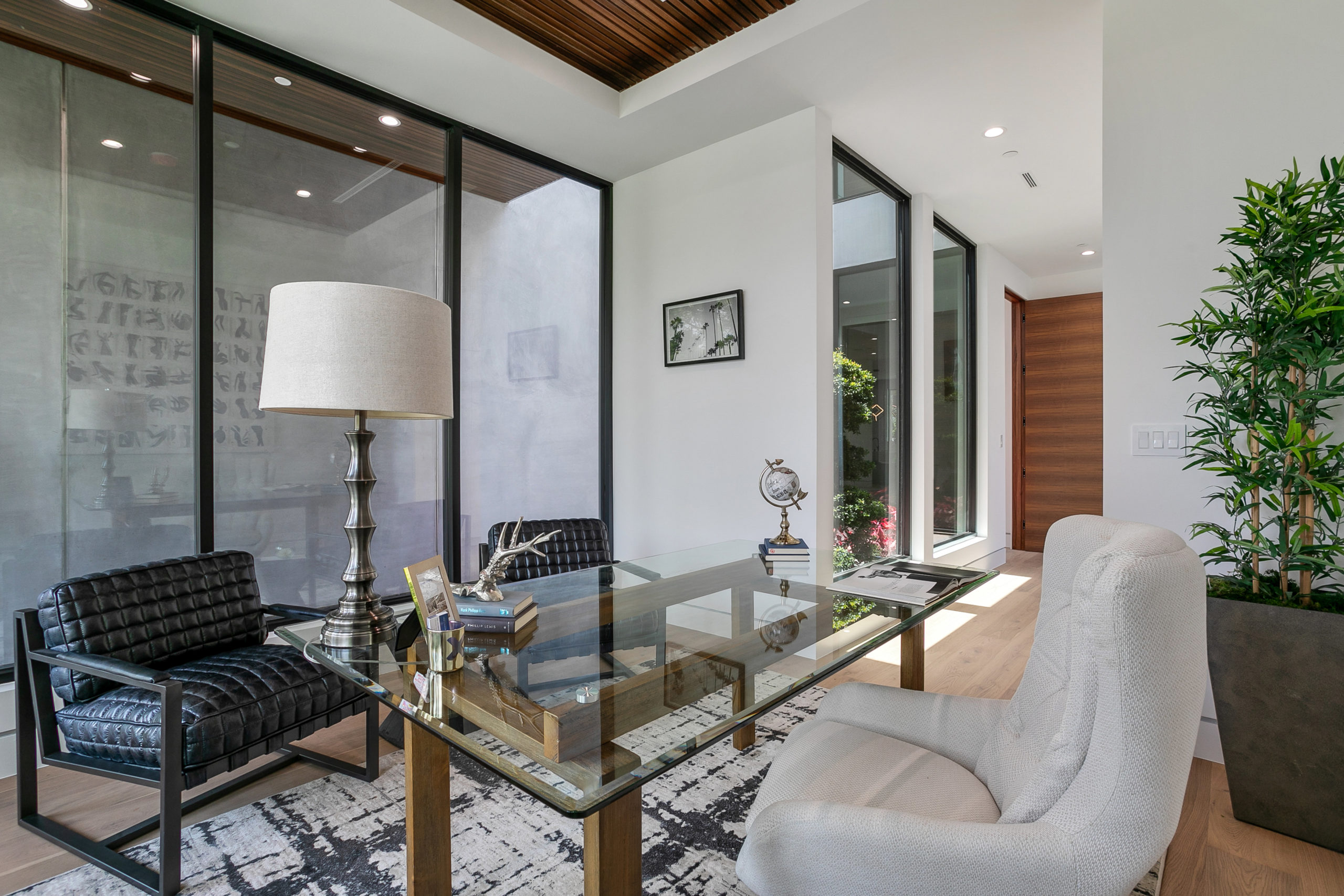 THE CROWN JEWEL OF BEVERLY GROVE! An ultimate modern find in L. A's hottest enclave offers a sweeping open floorplan with a grand entrance, accompanied by a contemporary foyer that leads to the oak wood finished first floor which features a theater, office, dining room and a gourmet kitchen with Miele appliances overlooking the fire lit living room with disappearing floor to ceiling glass doors welcoming you to the manicured private backyard with an outdoor kitchen, lounge area, wraparound pool/spa and a waterfall. Second floor holds a pristine master suite partnered by a luxurious bathroom, designer walk-in closet and a back terrace. Neighboring the master, lay 3 sizeable en suites and a laundry room. Making your way up the floating stairs, stages an entertainers rooftop deck with panoramic views, BBQ Island, and a freestanding jacuzzi. This exquisite new construction modern gem is a great home for the most discerning buyers.