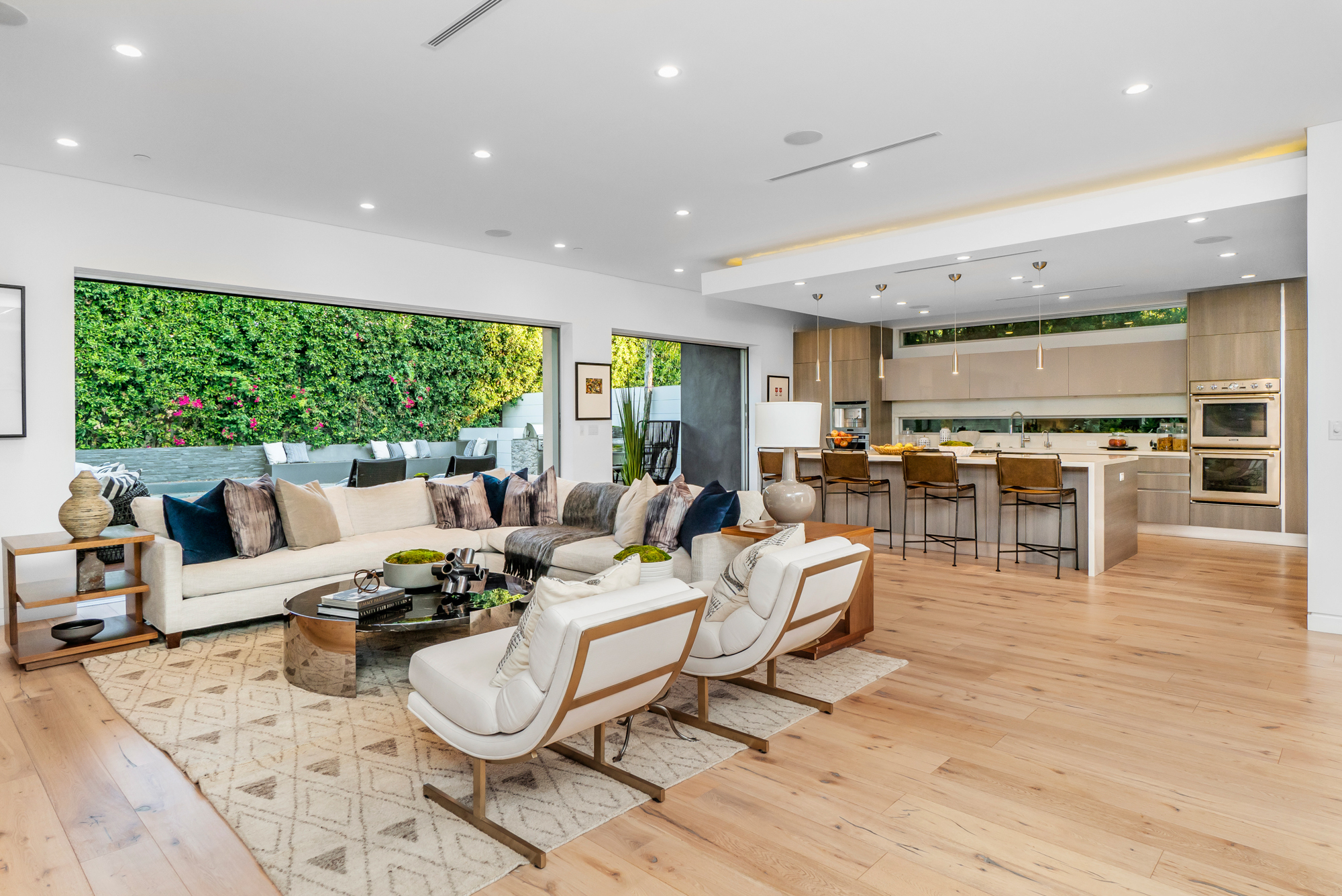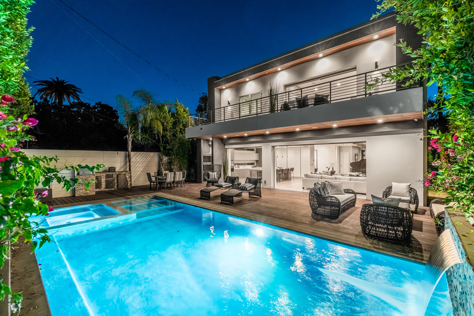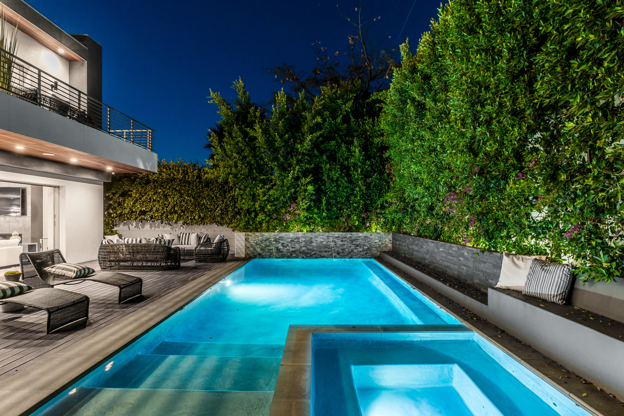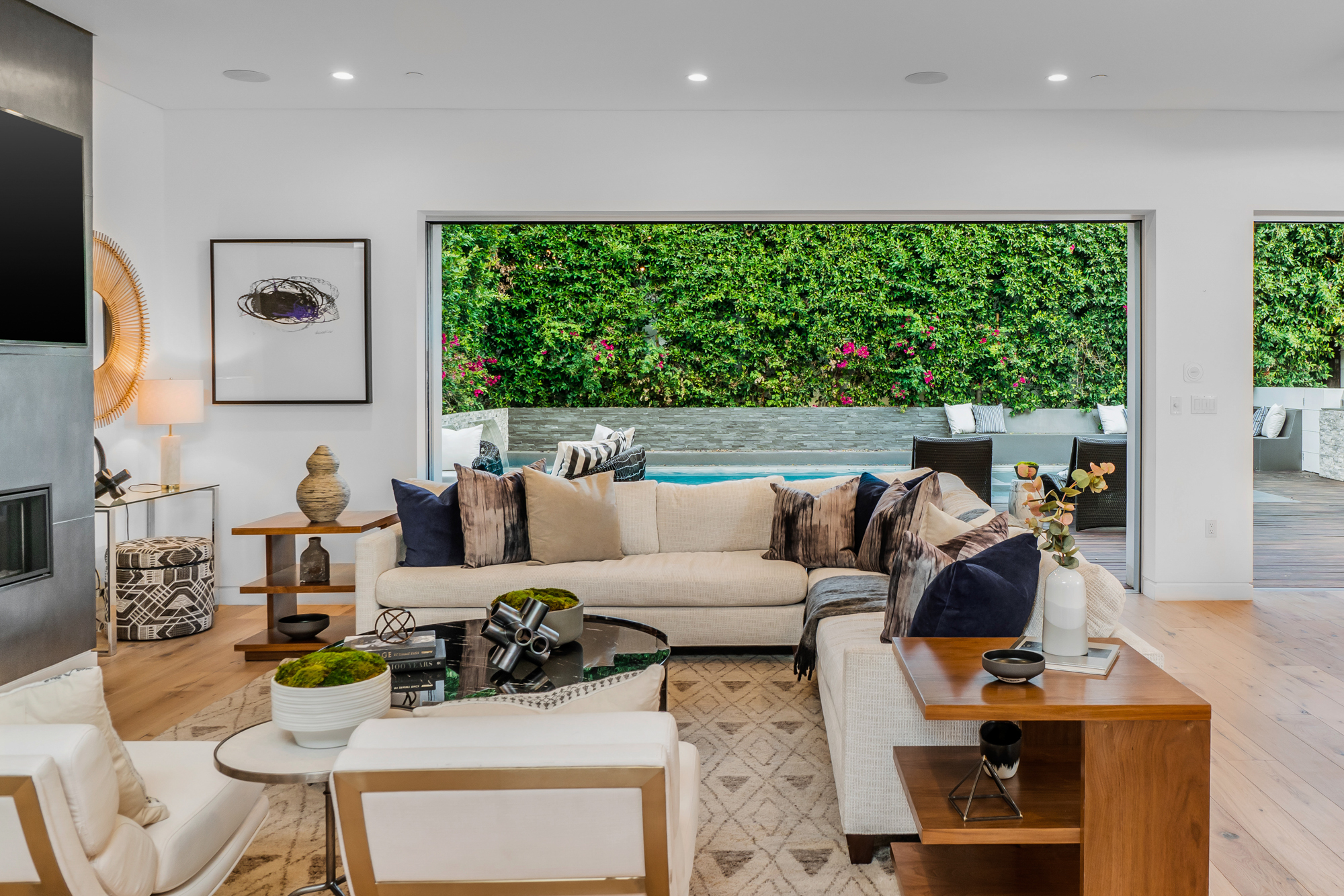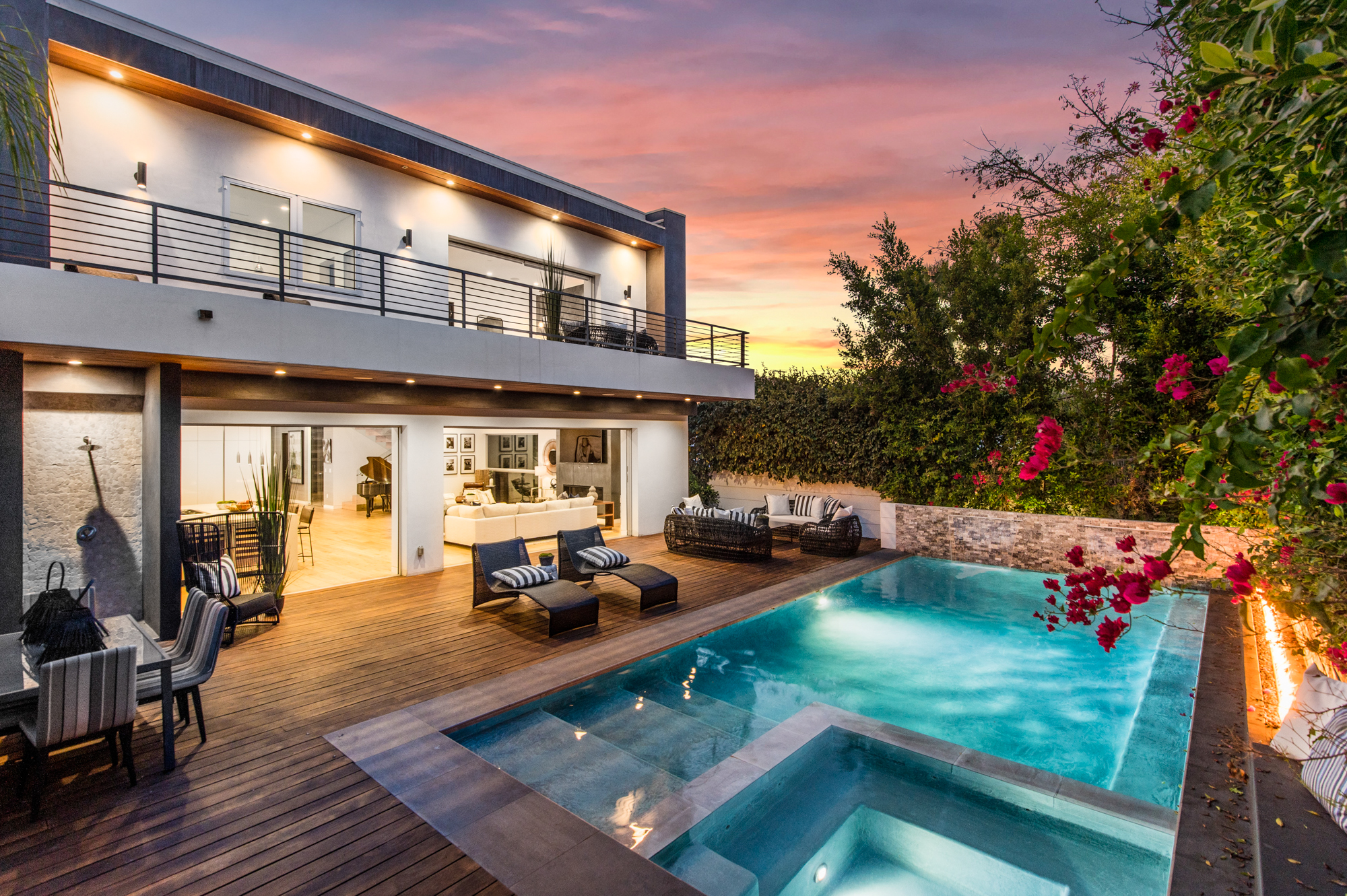 Tucked behind private gates and lush greenery, this newer construction home welcomes you to timeless design paired with luxurious finishes throughout. Open concept living allows for seamless entertaining from the elegant dining room, expansive family room, and glamorous chef’s kitchen. Enjoy preparing meals with top of the line Thermador appliances and a massive center island with room for seating. Continue the entertaining outdoors via large Fleetwood pocket doors from the family room & kitchen, extending the entertaining areas to a flush deck. The tranquil backyard sanctuary is equipped with a full outdoor kitchen with bbq, fire pit, built in lounge, pool & spa with waterfall feature, plenty of lounging space, powder room access from the side of the house, and an outdoor shower, perfect for a quick rinse off after a dip in the pool. Towering greenery and trees surround the backyard, offering ultimate privacy. Thoughtfully designed ensuite bedroom on the main floor is great for guests or an office. Striking floating staircase leads you upstairs to incredible hollywood sign views and an irresistible floorplan featuring four ensuite bedrooms, all offering their own exclusive private balconies. Additional bonus room at the top of the staircase presents possibilities for a second family room, office, play room, gym, etc. Adjacent, sliding doors lead to a beautiful outdoor lounge area with a color changing fireplace, perfect for relaxing and winding down before bed. Romantic master retreat showcases a boasting walk in closet, pocket doors to the balcony which spans the entire width of the house, and a see through fireplace, leading to the spa like master bathroom with a soaking tub, massive walk in shower, dual sinks, and privacy door. Enticing amenities include a wine cellar, laundry room, 2 car garage, and more. Enjoy a luxurious Hollywood lifestyle people dream about! Just moments from renowned shops, dining, and the Hollywood farmers market, it doesn’t get better than this.