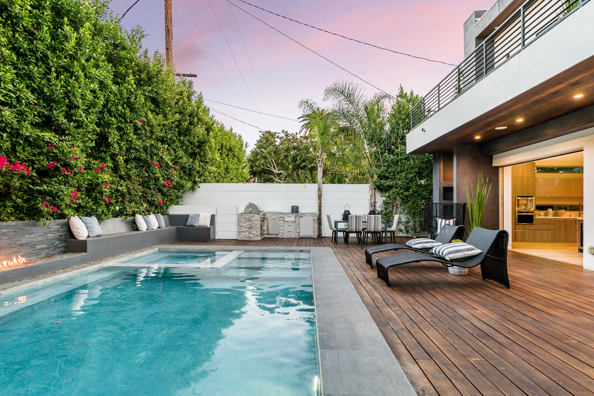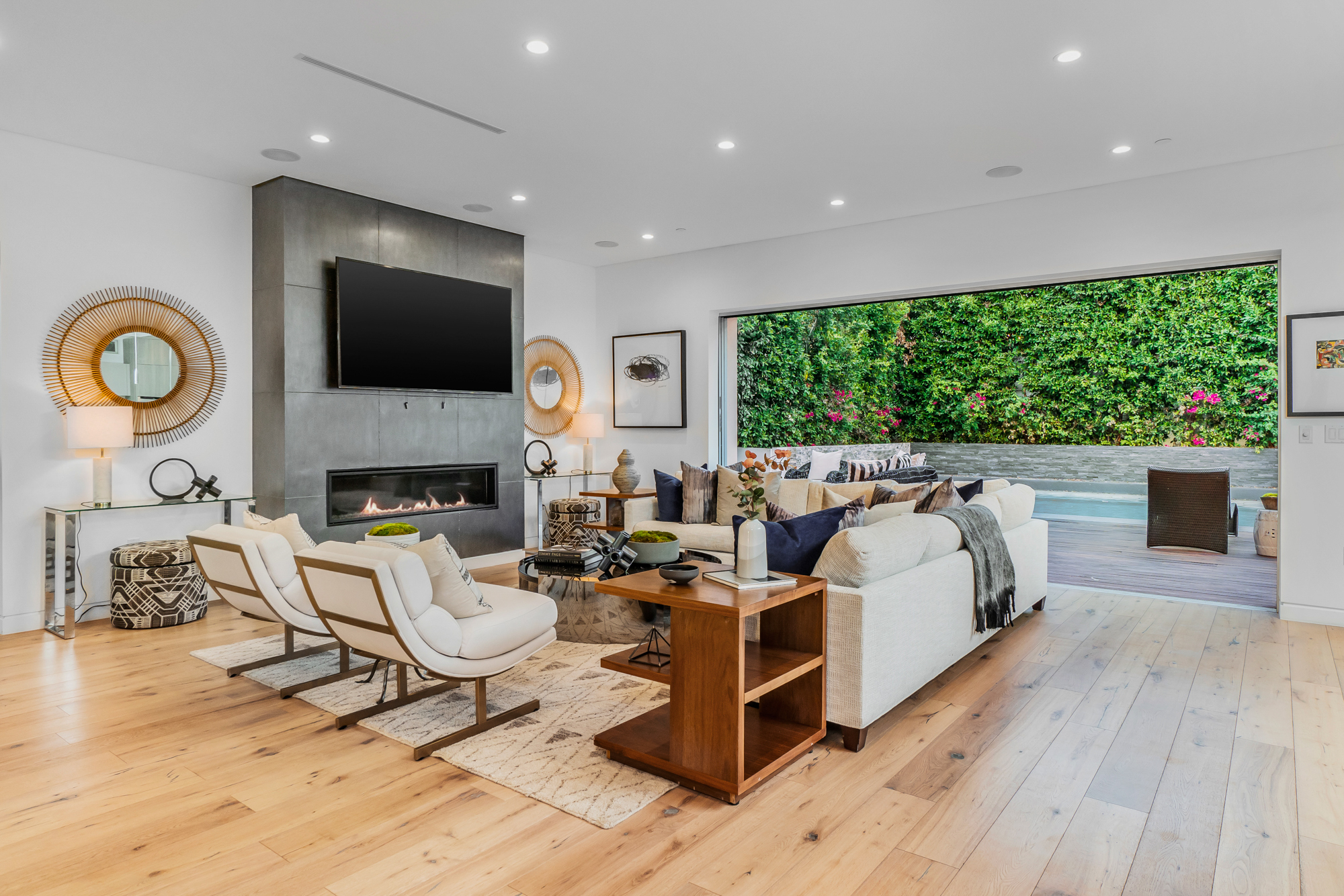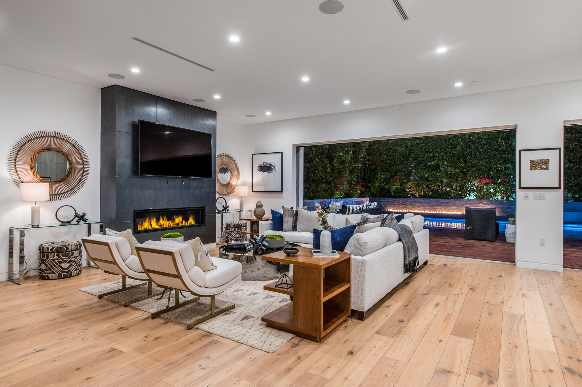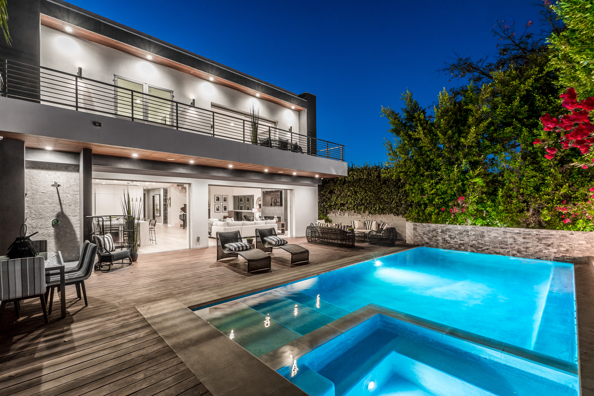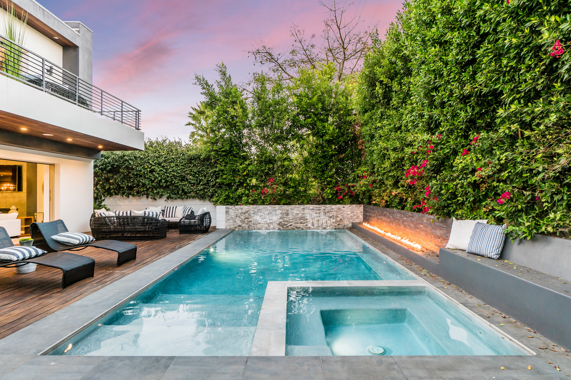 Tucked behind private gates and lush greenery, this newer construction home welcomes you to timeless design paired with luxurious finishes throughout. Open concept living allows for seamless entertaining from the elegant dining room, expansive family room, and glamorous chef’s kitchen. Enjoy preparing meals with top of the line Thermador appliances and a massive center island with room for seating. Continue the entertaining outdoors via large Fleetwood pocket doors from the family room & kitchen, extending the entertaining areas to a flush deck. The tranquil backyard sanctuary is equipped with a full outdoor kitchen with bbq, fire pit, built in lounge, pool & spa with waterfall feature, plenty of lounging space, powder room access from the side of the house, and an outdoor shower, perfect for a quick rinse off after a dip in the pool. Towering greenery and trees surround the backyard, offering ultimate privacy. Thoughtfully designed ensuite bedroom on the main floor is great for guests or an office. Striking floating staircase leads you upstairs to incredible hollywood sign views and an irresistible floorplan featuring four ensuite bedrooms, all offering their own exclusive private balconies. Additional bonus room at the top of the staircase presents possibilities for a second family room, office, play room, gym, etc. Adjacent, sliding doors lead to a beautiful outdoor lounge area with a color changing fireplace, perfect for relaxing and winding down before bed. Romantic master retreat showcases a boasting walk in closet, pocket doors to the balcony which spans the entire width of the house, and a see through fireplace, leading to the spa like master bathroom with a soaking tub, massive walk in shower, dual sinks, and privacy door. Enticing amenities include a wine cellar, laundry room, 2 car garage, and more. Enjoy a luxurious Hollywood lifestyle people dream about! Just moments from renowned shops, dining, and the Hollywood farmers market, it doesn’t get better than this.