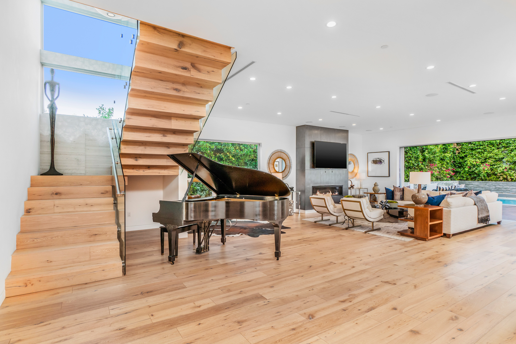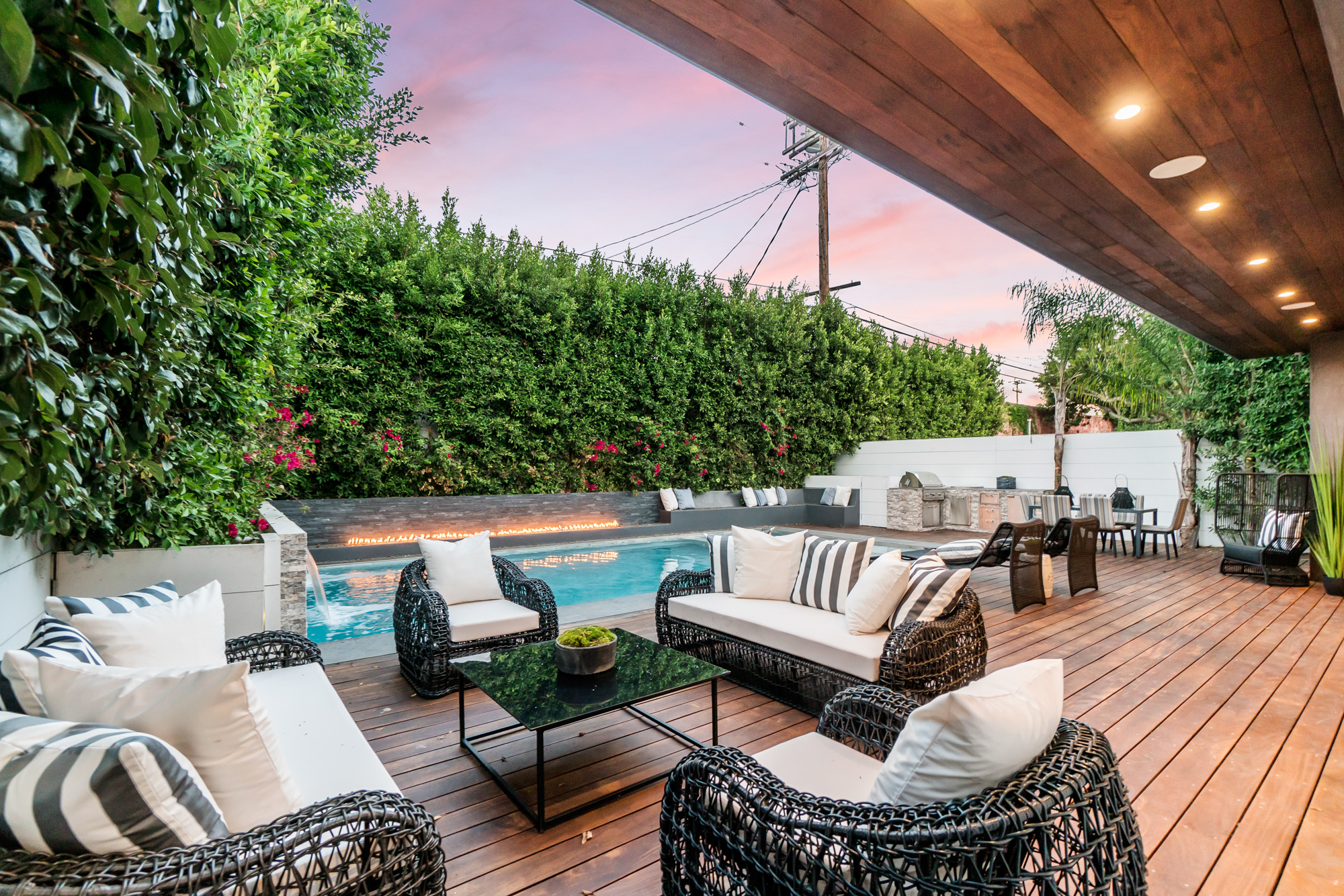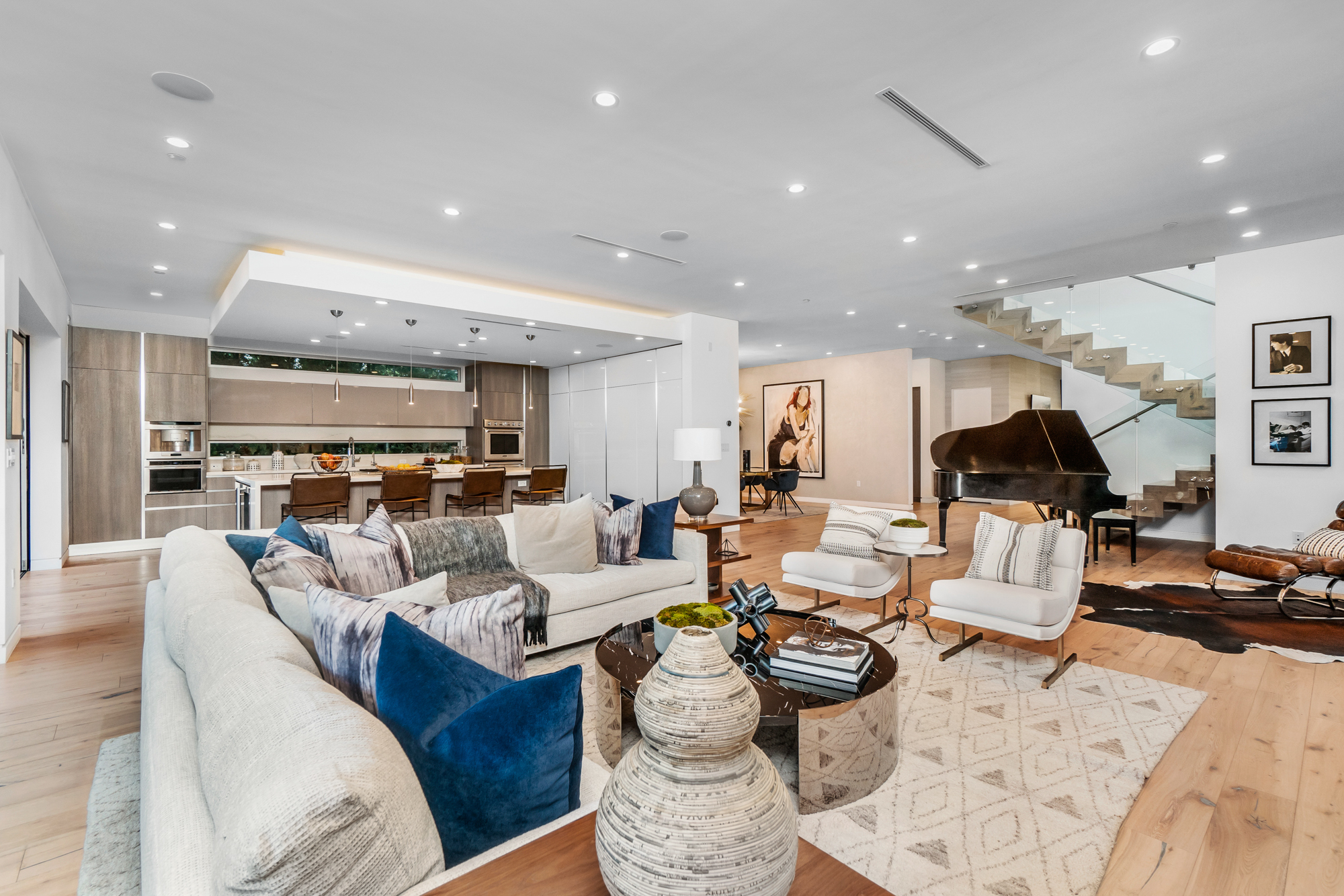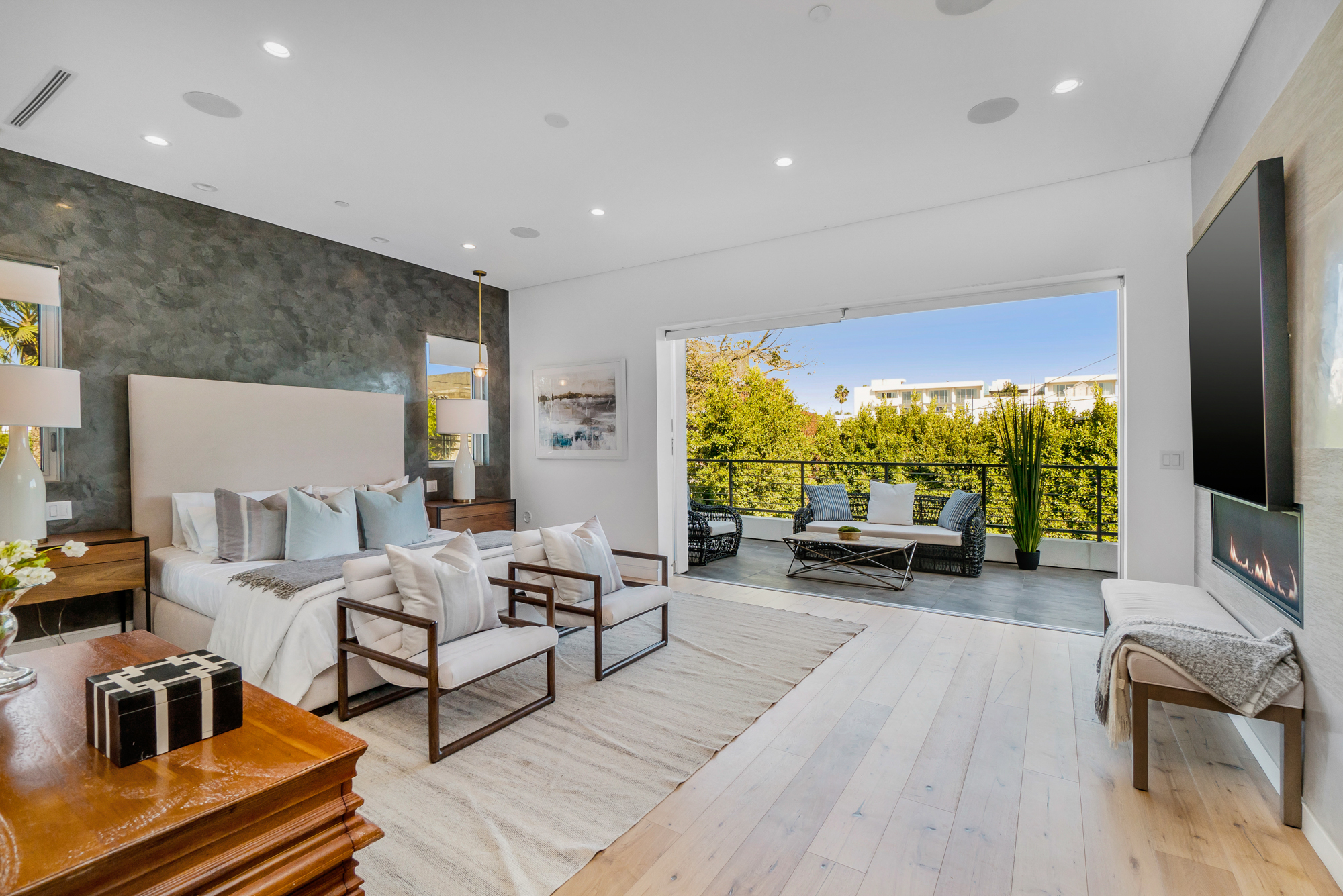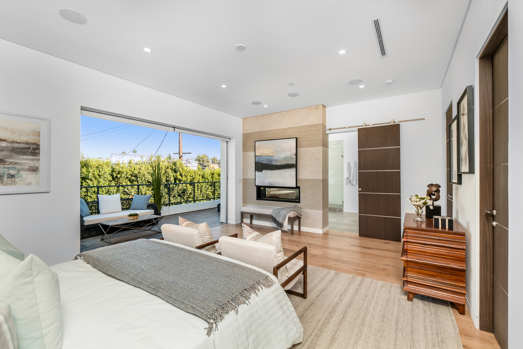 Tucked behind private gates and lush greenery, this newer construction home welcomes you to timeless design paired with luxurious finishes throughout. Open concept living allows for seamless entertaining from the elegant dining room, expansive family room, and glamorous chef’s kitchen. Enjoy preparing meals with top of the line Thermador appliances and a massive center island with room for seating. Continue the entertaining outdoors via large Fleetwood pocket doors from the family room & kitchen, extending the entertaining areas to a flush deck. The tranquil backyard sanctuary is equipped with a full outdoor kitchen with bbq, fire pit, built in lounge, pool & spa with waterfall feature, plenty of lounging space, powder room access from the side of the house, and an outdoor shower, perfect for a quick rinse off after a dip in the pool. Towering greenery and trees surround the backyard, offering ultimate privacy. Thoughtfully designed ensuite bedroom on the main floor is great for guests or an office. Striking floating staircase leads you upstairs to incredible hollywood sign views and an irresistible floorplan featuring four ensuite bedrooms, all offering their own exclusive private balconies. Additional bonus room at the top of the staircase presents possibilities for a second family room, office, play room, gym, etc. Adjacent, sliding doors lead to a beautiful outdoor lounge area with a color changing fireplace, perfect for relaxing and winding down before bed. Romantic master retreat showcases a boasting walk in closet, pocket doors to the balcony which spans the entire width of the house, and a see through fireplace, leading to the spa like master bathroom with a soaking tub, massive walk in shower, dual sinks, and privacy door. Enticing amenities include a wine cellar, laundry room, 2 car garage, and more. Enjoy a luxurious Hollywood lifestyle people dream about! Just moments from renowned shops, dining, and the Hollywood farmers market, it doesn’t get better than this.