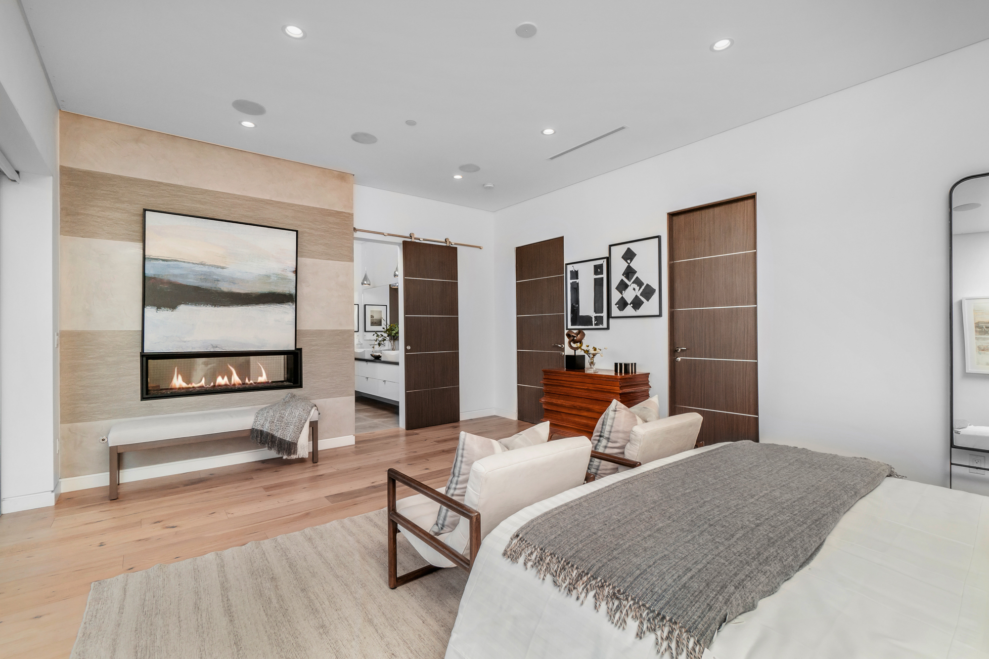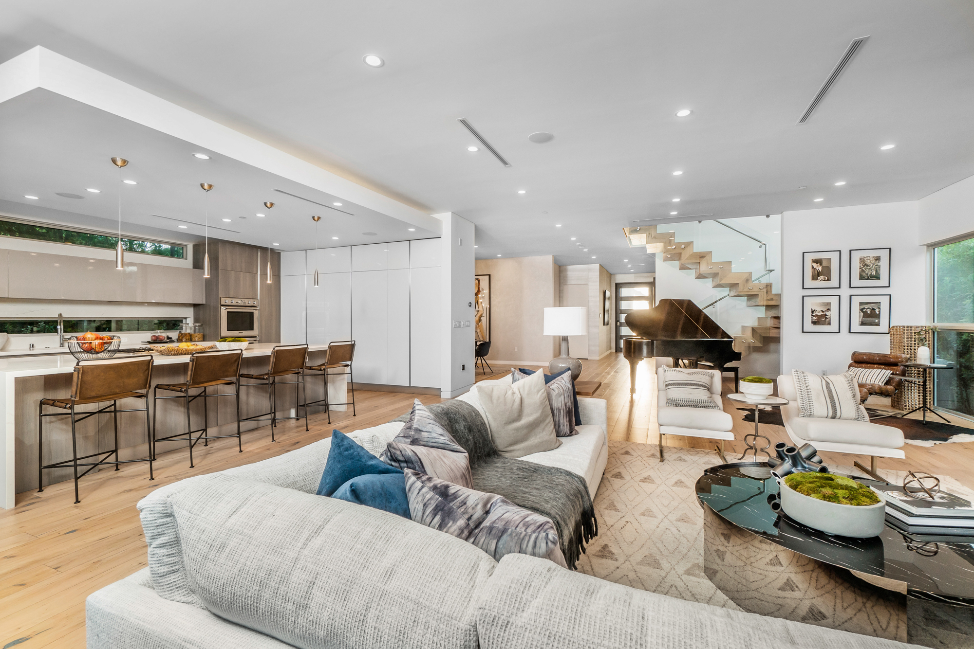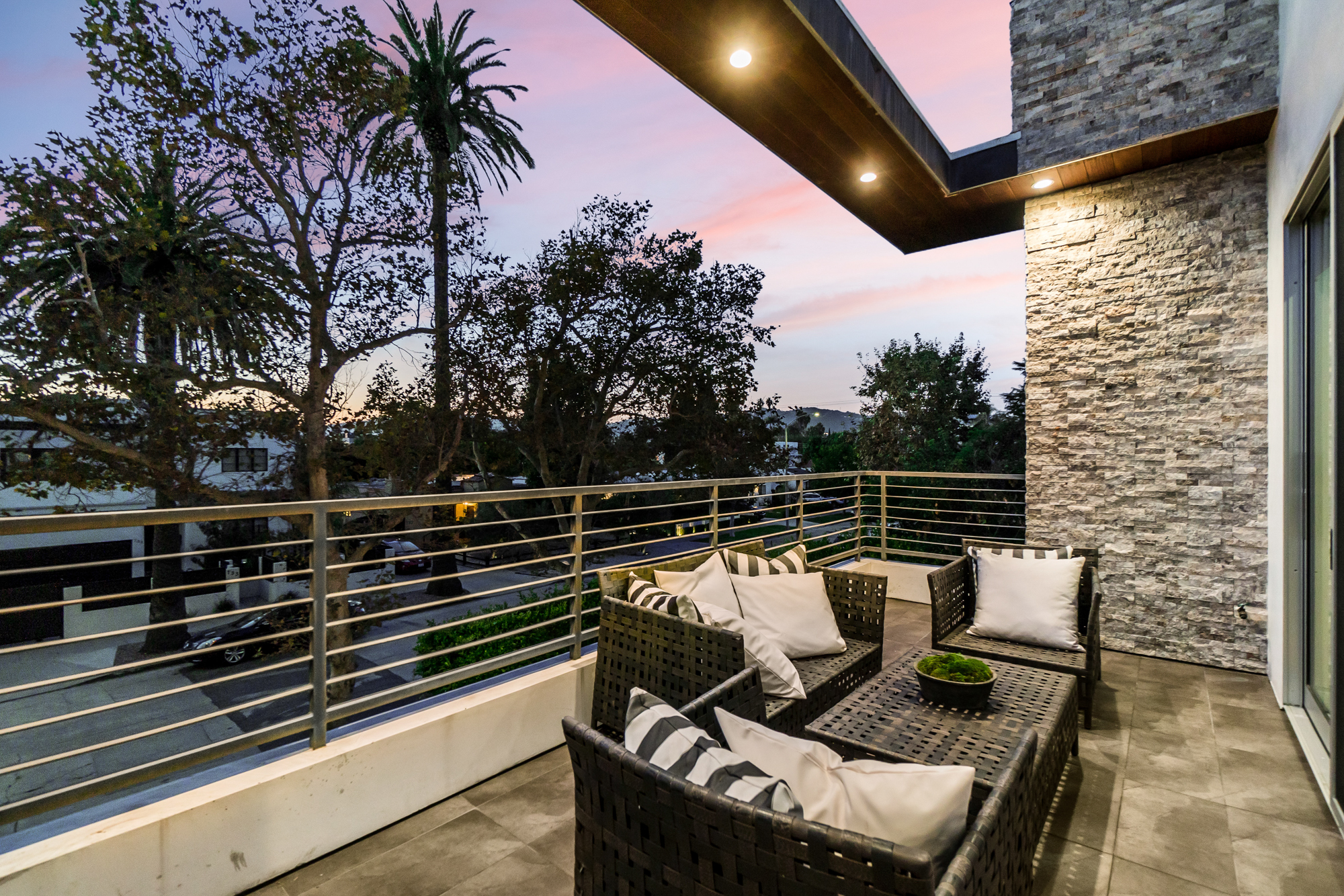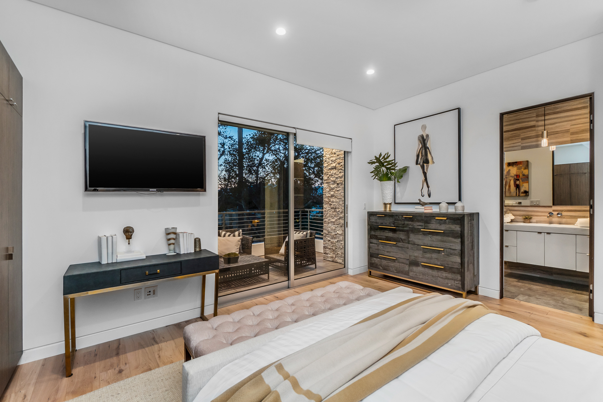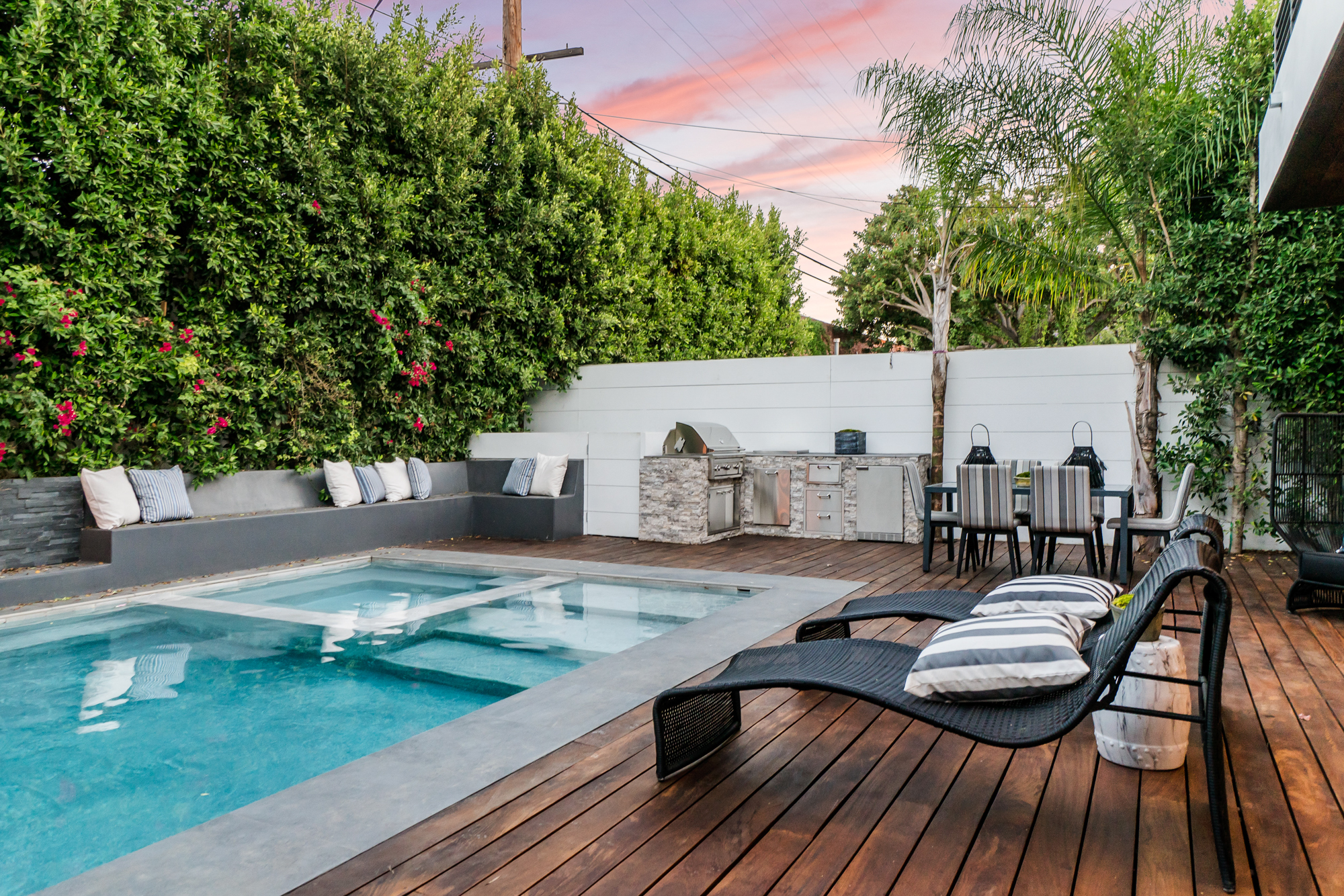 Tucked behind private gates and lush greenery, this newer construction home welcomes you to timeless design paired with luxurious finishes throughout. Open concept living allows for seamless entertaining from the elegant dining room, expansive family room, and glamorous chef’s kitchen. Enjoy preparing meals with top of the line Thermador appliances and a massive center island with room for seating. Continue the entertaining outdoors via large Fleetwood pocket doors from the family room & kitchen, extending the entertaining areas to a flush deck. The tranquil backyard sanctuary is equipped with a full outdoor kitchen with bbq, fire pit, built in lounge, pool & spa with waterfall feature, plenty of lounging space, powder room access from the side of the house, and an outdoor shower, perfect for a quick rinse off after a dip in the pool. Towering greenery and trees surround the backyard, offering ultimate privacy. Thoughtfully designed ensuite bedroom on the main floor is great for guests or an office. Striking floating staircase leads you upstairs to incredible hollywood sign views and an irresistible floorplan featuring four ensuite bedrooms, all offering their own exclusive private balconies. Additional bonus room at the top of the staircase presents possibilities for a second family room, office, play room, gym, etc. Adjacent, sliding doors lead to a beautiful outdoor lounge area with a color changing fireplace, perfect for relaxing and winding down before bed. Romantic master retreat showcases a boasting walk in closet, pocket doors to the balcony which spans the entire width of the house, and a see through fireplace, leading to the spa like master bathroom with a soaking tub, massive walk in shower, dual sinks, and privacy door. Enticing amenities include a wine cellar, laundry room, 2 car garage, and more. Enjoy a luxurious Hollywood lifestyle people dream about! Just moments from renowned shops, dining, and the Hollywood farmers market, it doesn’t get better than this.