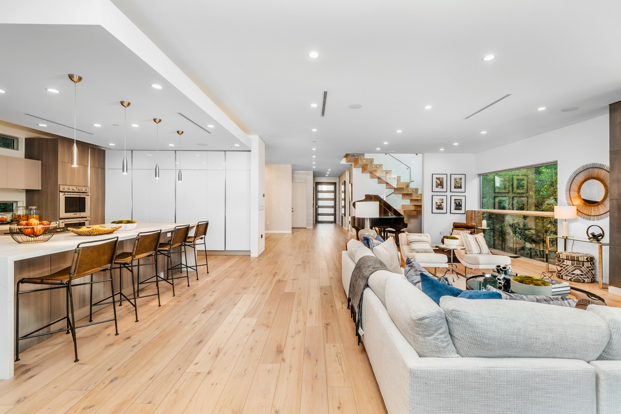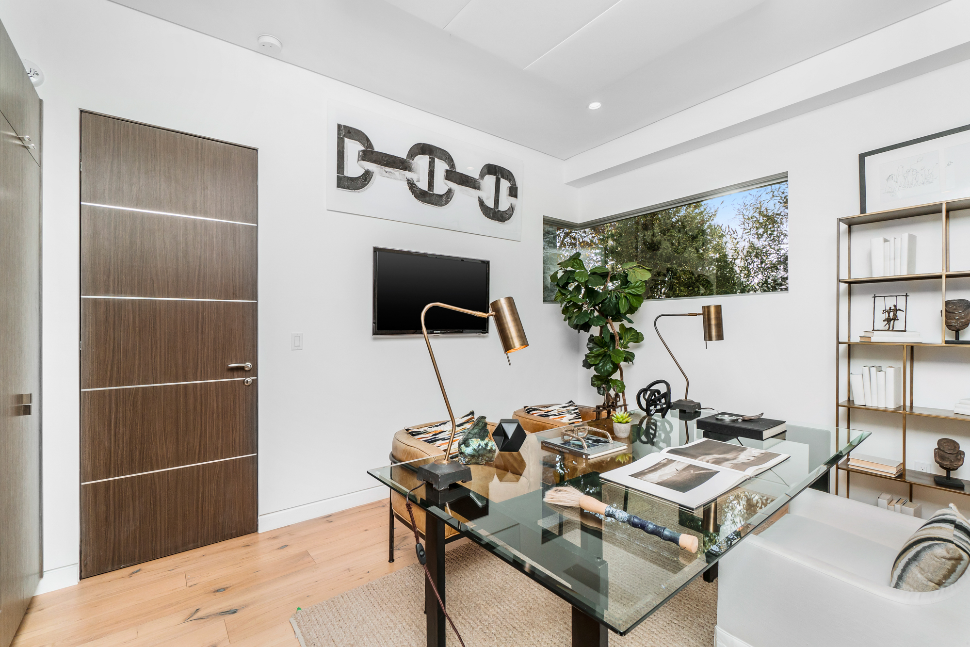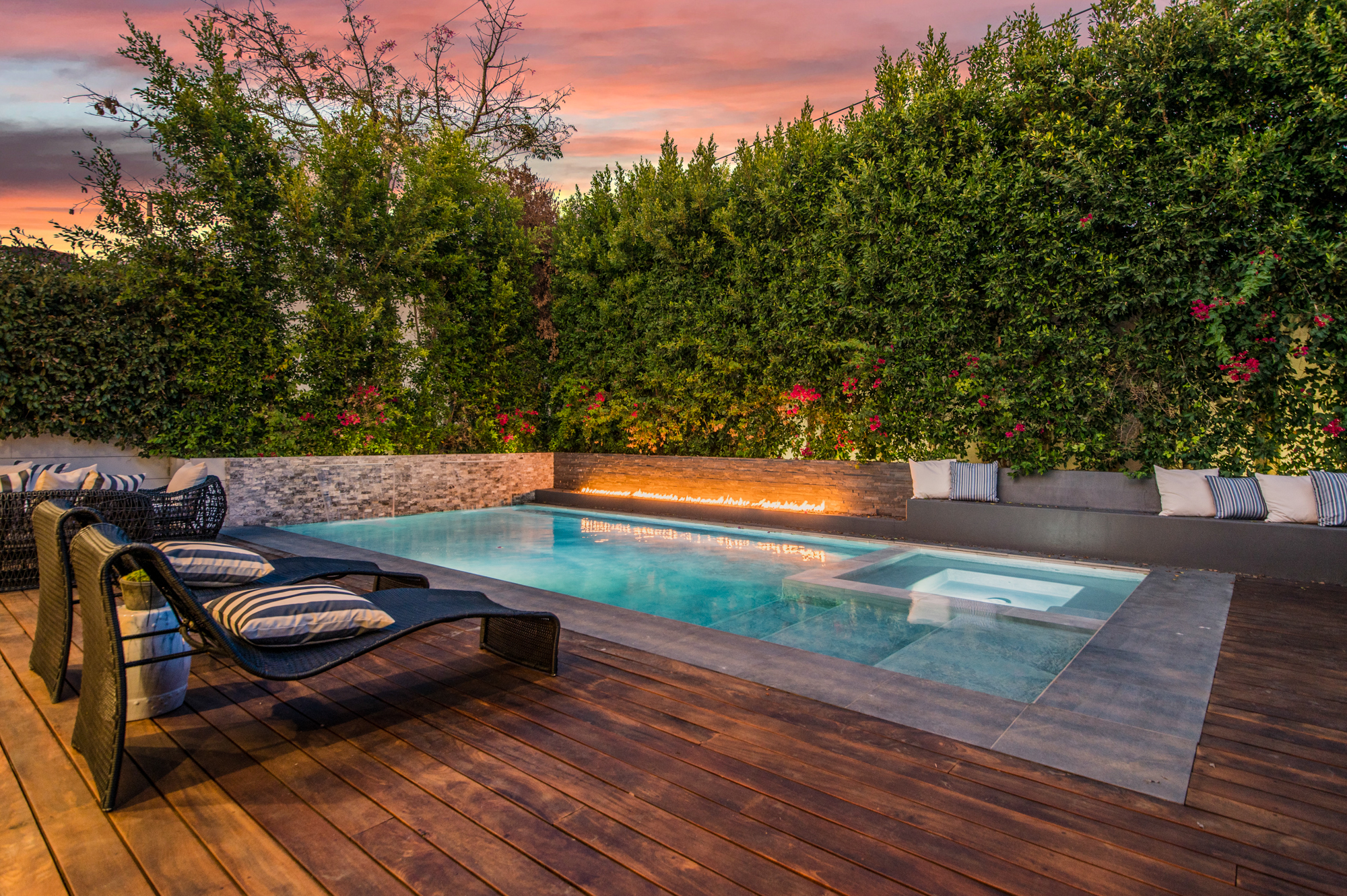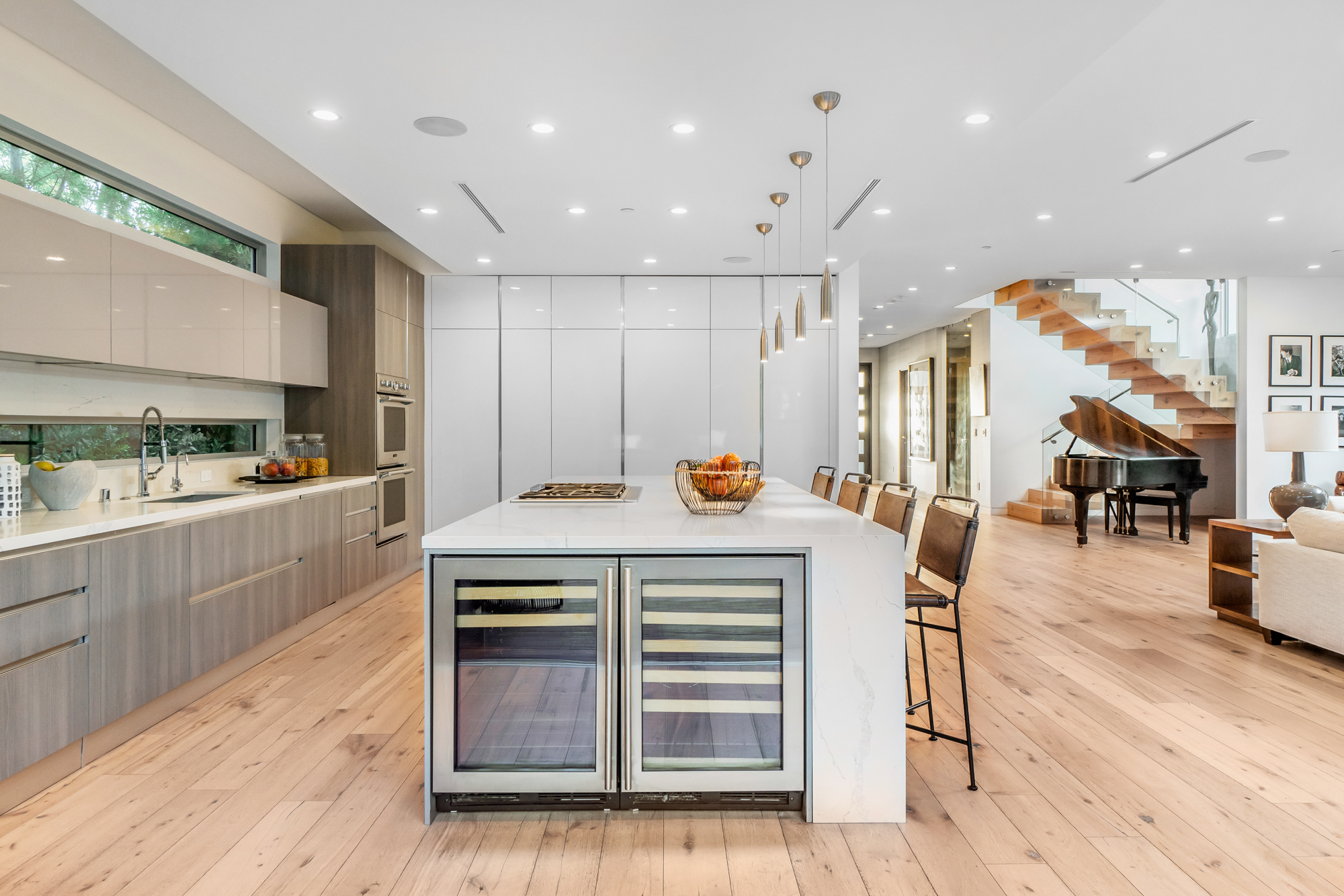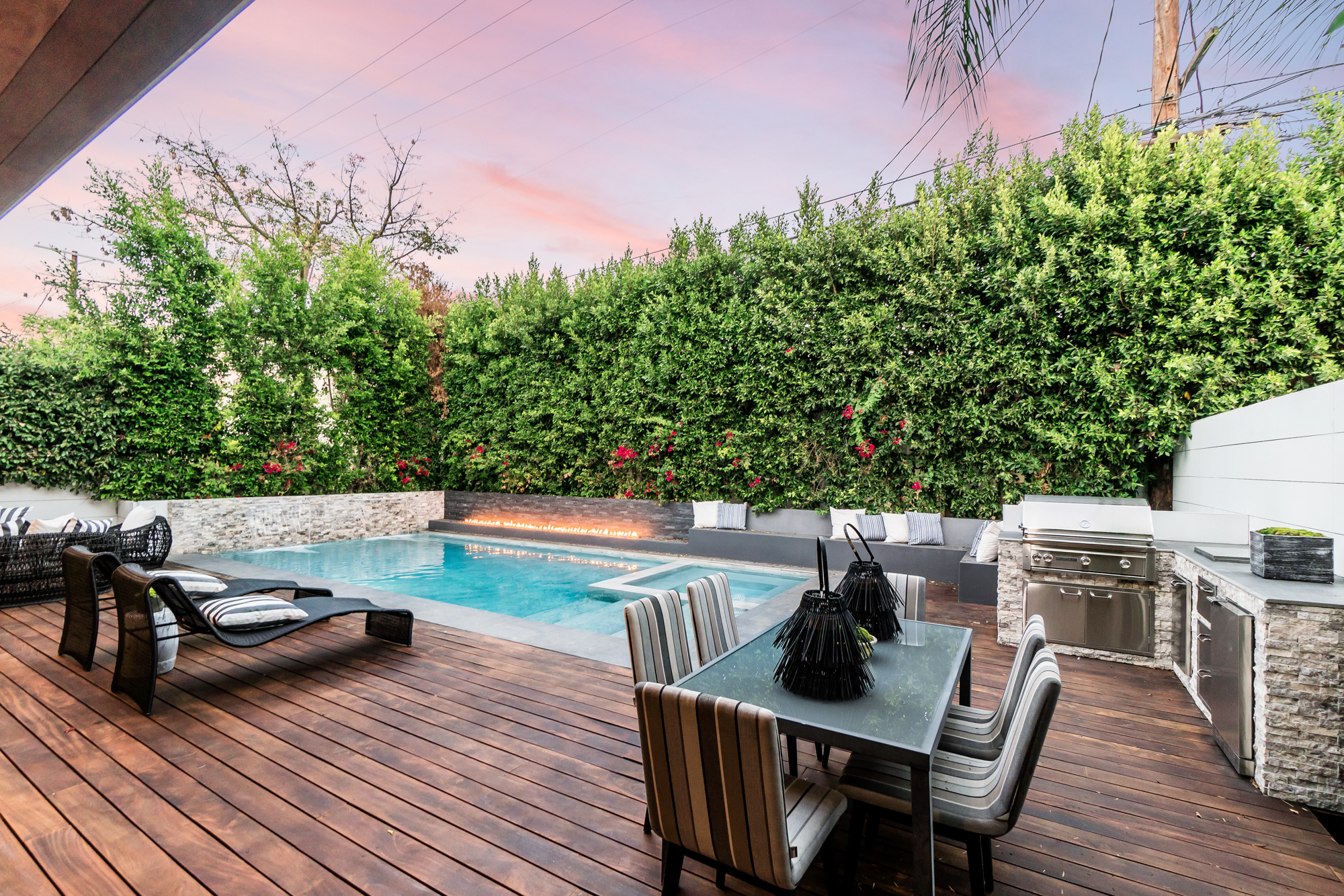 Tucked behind private gates and lush greenery, this newer construction home welcomes you to timeless design paired with luxurious finishes throughout. Open concept living allows for seamless entertaining from the elegant dining room, expansive family room, and glamorous chef’s kitchen. Enjoy preparing meals with top of the line Thermador appliances and a massive center island with room for seating. Continue the entertaining outdoors via large Fleetwood pocket doors from the family room & kitchen, extending the entertaining areas to a flush deck. The tranquil backyard sanctuary is equipped with a full outdoor kitchen with bbq, fire pit, built in lounge, pool & spa with waterfall feature, plenty of lounging space, powder room access from the side of the house, and an outdoor shower, perfect for a quick rinse off after a dip in the pool. Towering greenery and trees surround the backyard, offering ultimate privacy. Thoughtfully designed ensuite bedroom on the main floor is great for guests or an office. Striking floating staircase leads you upstairs to incredible hollywood sign views and an irresistible floorplan featuring four ensuite bedrooms, all offering their own exclusive private balconies. Additional bonus room at the top of the staircase presents possibilities for a second family room, office, play room, gym, etc. Adjacent, sliding doors lead to a beautiful outdoor lounge area with a color changing fireplace, perfect for relaxing and winding down before bed. Romantic master retreat showcases a boasting walk in closet, pocket doors to the balcony which spans the entire width of the house, and a see through fireplace, leading to the spa like master bathroom with a soaking tub, massive walk in shower, dual sinks, and privacy door. Enticing amenities include a wine cellar, laundry room, 2 car garage, and more. Enjoy a luxurious Hollywood lifestyle people dream about! Just moments from renowned shops, dining, and the Hollywood farmers market, it doesn’t get better than this.