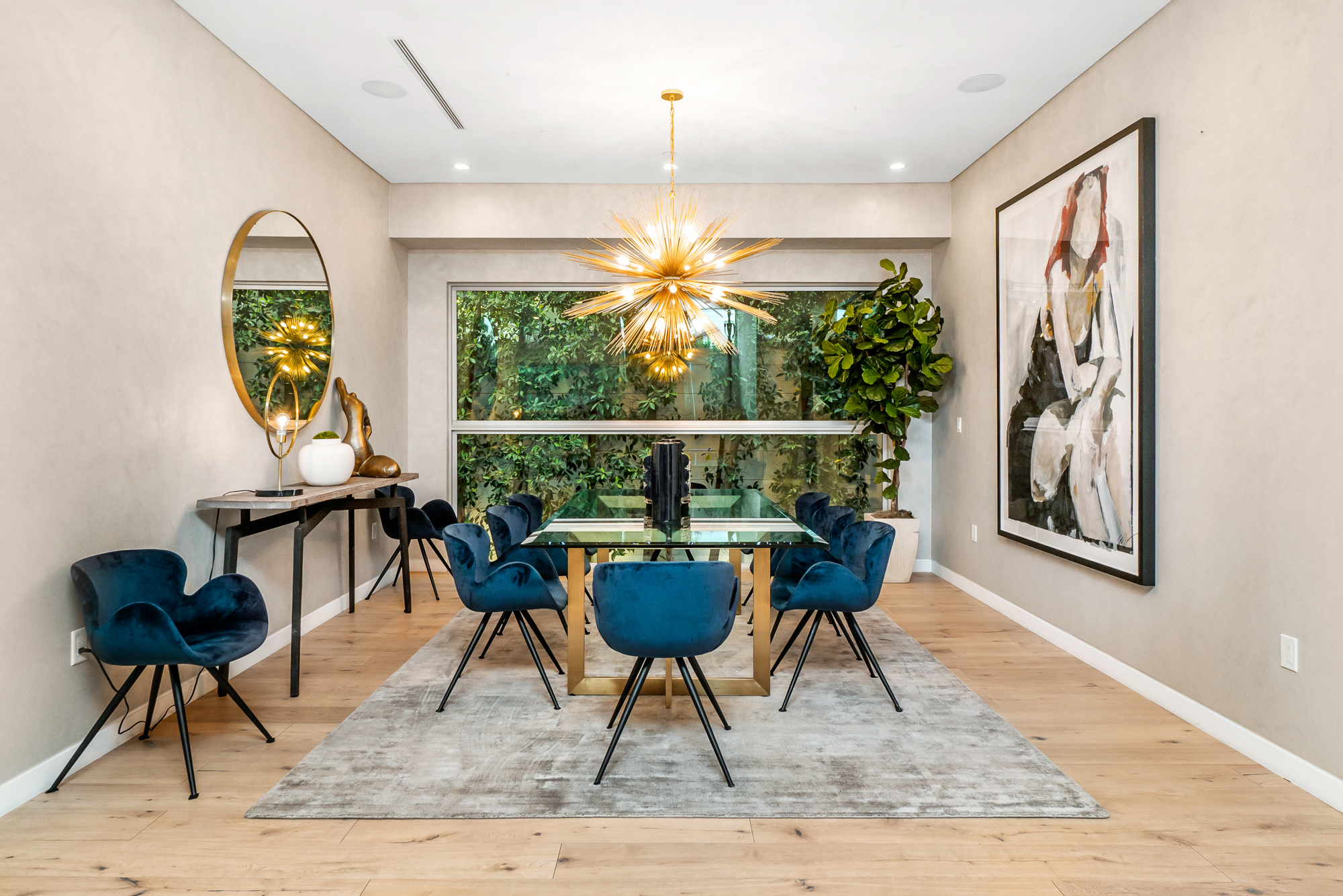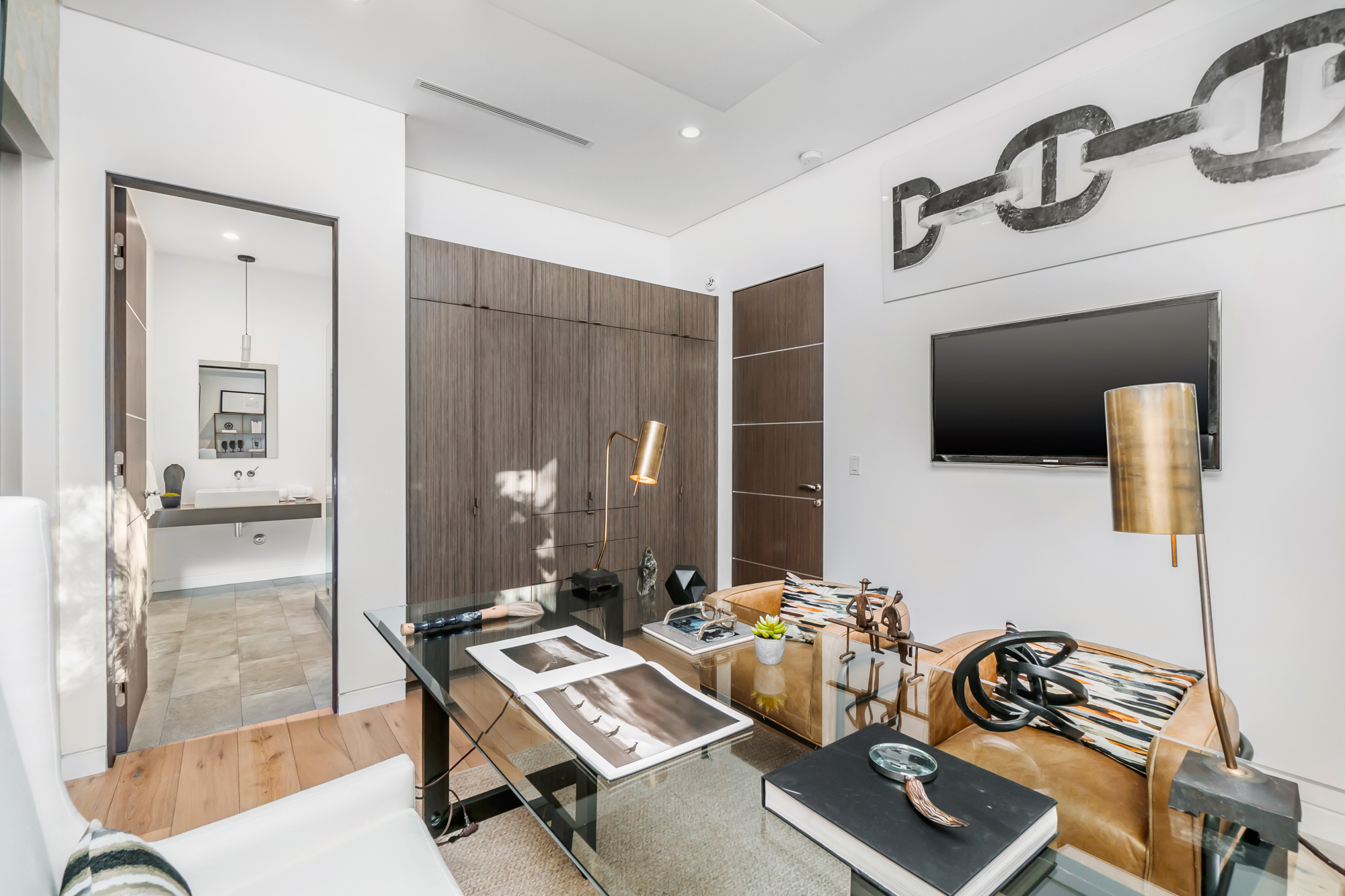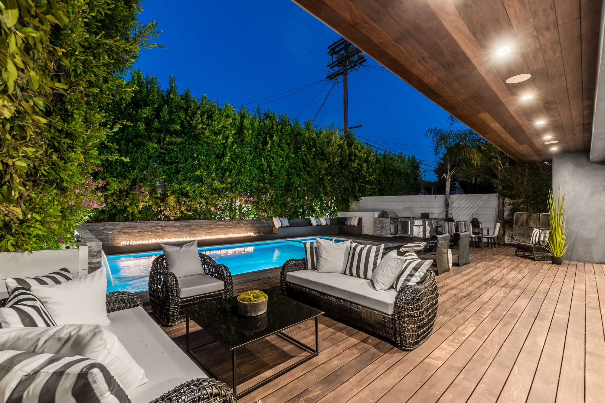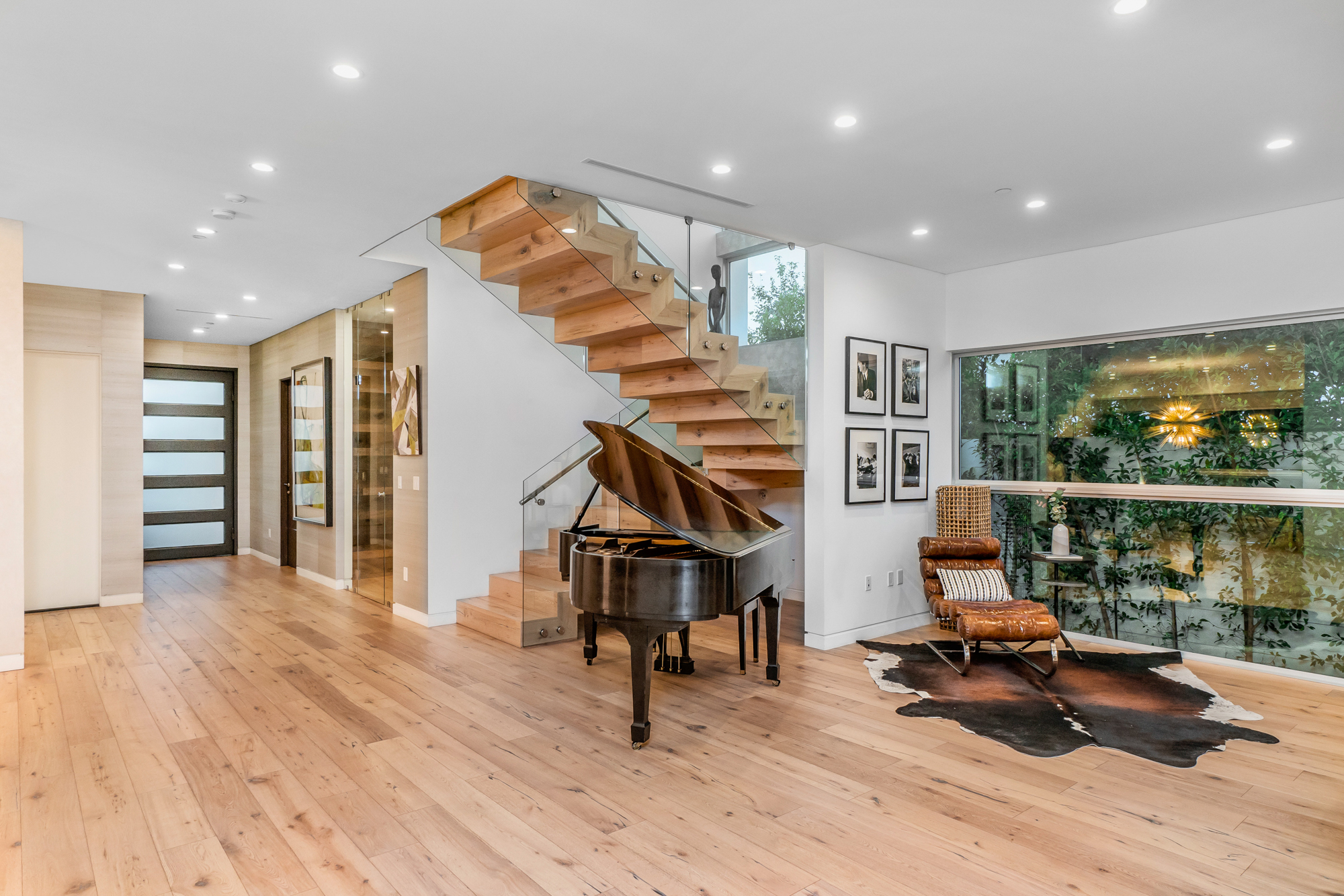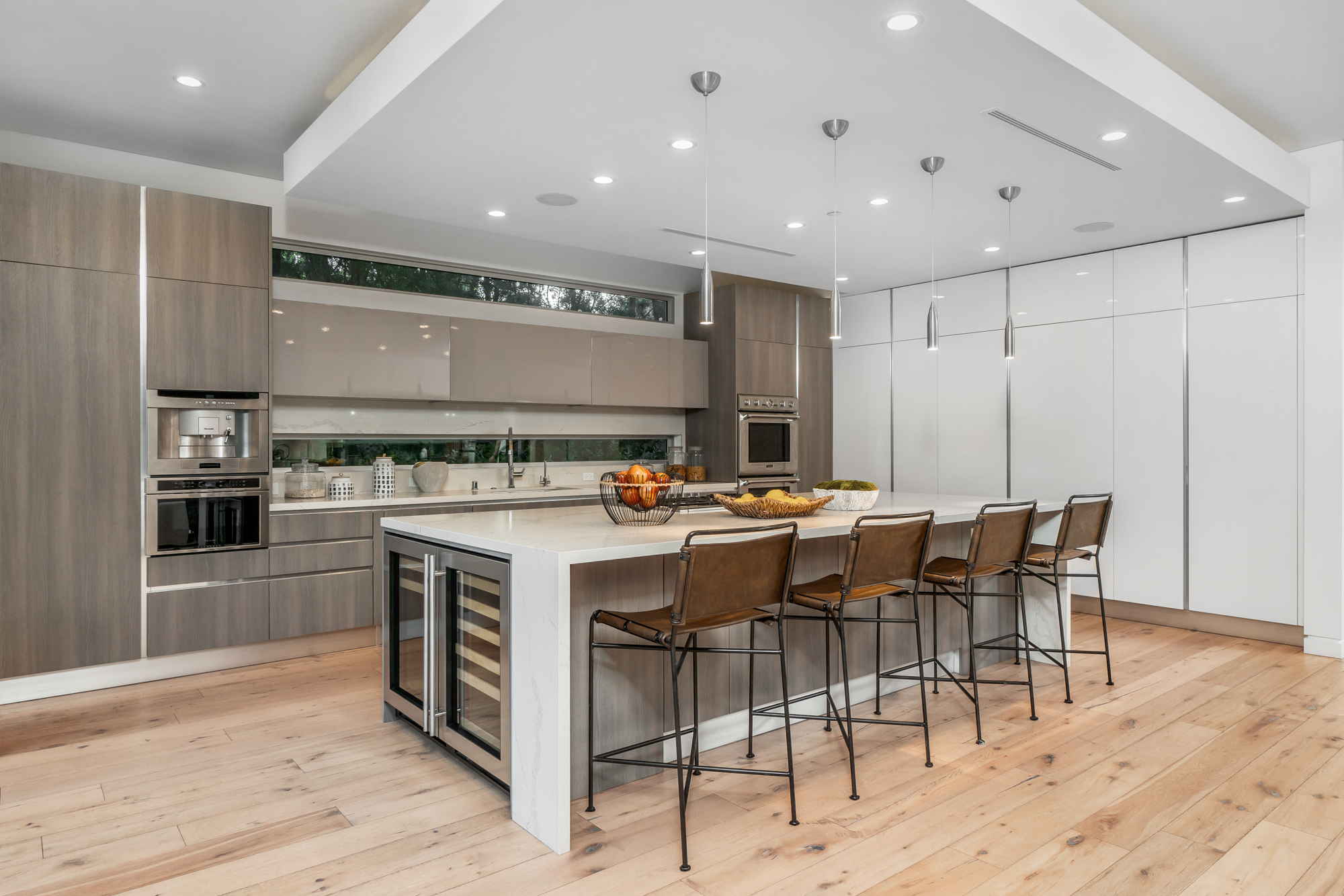 Tucked behind private gates and lush greenery, this newer construction home welcomes you to timeless design paired with luxurious finishes throughout. Open concept living allows for seamless entertaining from the elegant dining room, expansive family room, and glamorous chef’s kitchen. Enjoy preparing meals with top of the line Thermador appliances and a massive center island with room for seating. Continue the entertaining outdoors via large Fleetwood pocket doors from the family room & kitchen, extending the entertaining areas to a flush deck. The tranquil backyard sanctuary is equipped with a full outdoor kitchen with bbq, fire pit, built in lounge, pool & spa with waterfall feature, plenty of lounging space, powder room access from the side of the house, and an outdoor shower, perfect for a quick rinse off after a dip in the pool. Towering greenery and trees surround the backyard, offering ultimate privacy. Thoughtfully designed ensuite bedroom on the main floor is great for guests or an office. Striking floating staircase leads you upstairs to incredible hollywood sign views and an irresistible floorplan featuring four ensuite bedrooms, all offering their own exclusive private balconies. Additional bonus room at the top of the staircase presents possibilities for a second family room, office, play room, gym, etc. Adjacent, sliding doors lead to a beautiful outdoor lounge area with a color changing fireplace, perfect for relaxing and winding down before bed. Romantic master retreat showcases a boasting walk in closet, pocket doors to the balcony which spans the entire width of the house, and a see through fireplace, leading to the spa like master bathroom with a soaking tub, massive walk in shower, dual sinks, and privacy door. Enticing amenities include a wine cellar, laundry room, 2 car garage, and more. Enjoy a luxurious Hollywood lifestyle people dream about! Just moments from renowned shops, dining, and the Hollywood farmers market, it doesn’t get better than this.