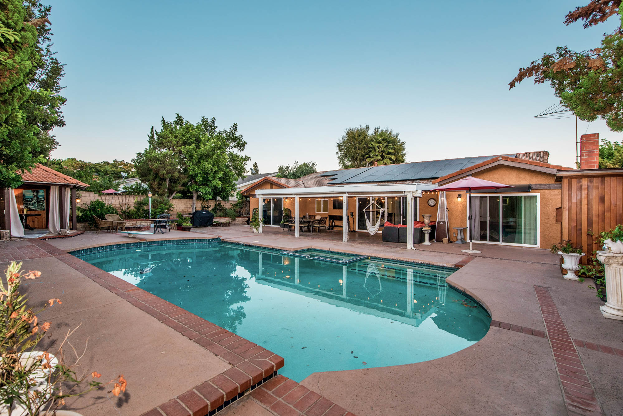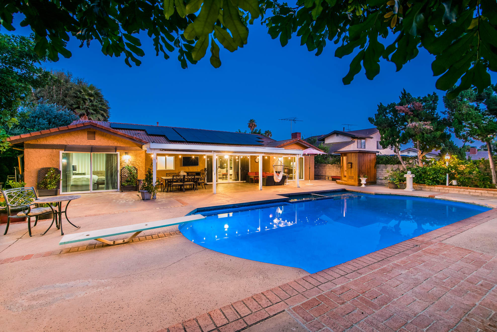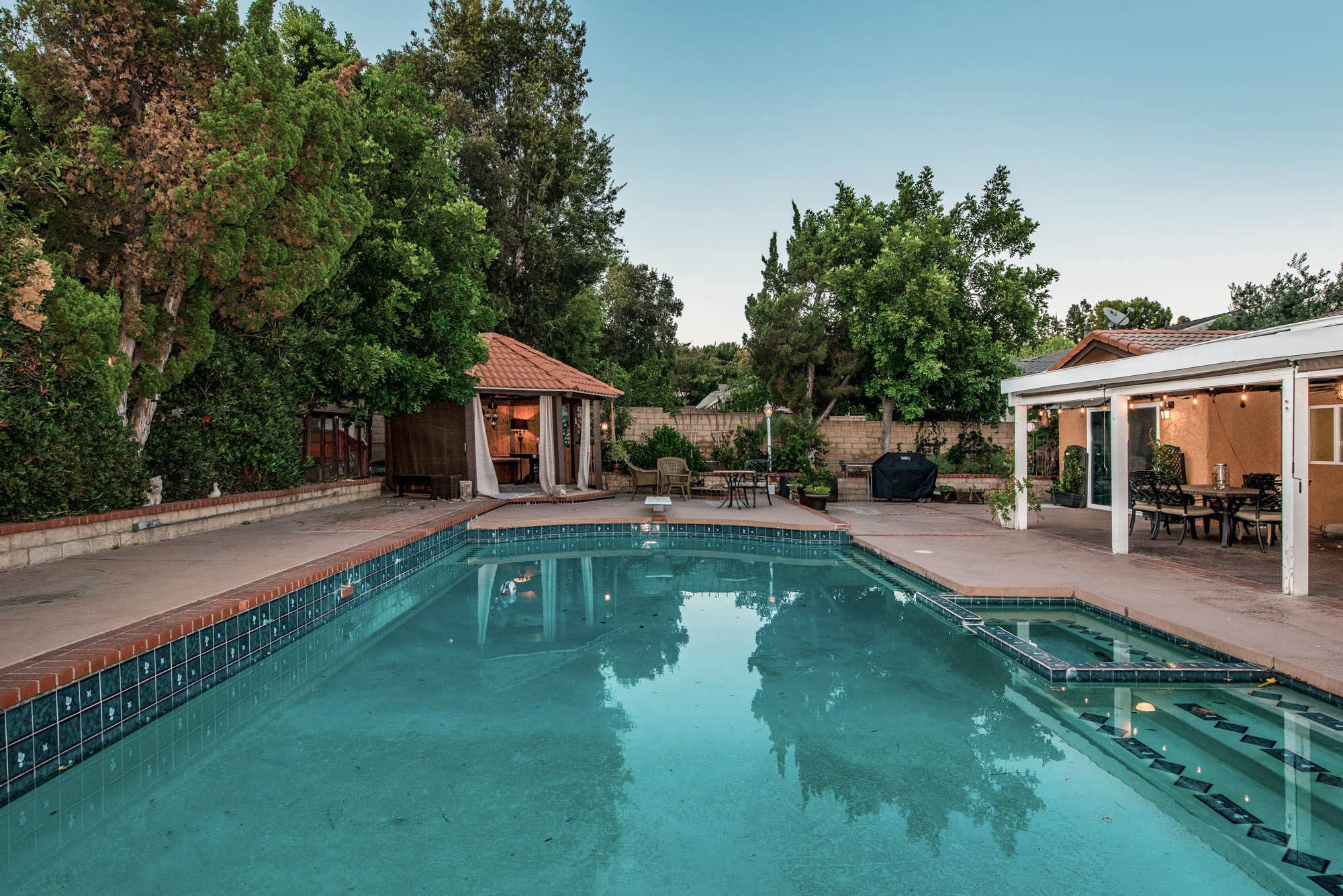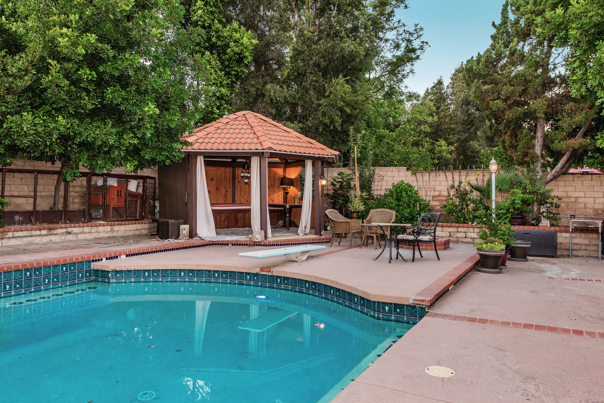 Located in the heart of Northridge, this fully remodeled home leaves no room for disappointment. Sitting on a large 10,715 sq ft lot, it offers a large driveway, spacious backyard, and ample side yard space. Entering the home, an open floor plan greets you with a large living room, dining room, and chef’s kitchen. 3 sets of large sliding doors located in the living space and two of the bedrooms lead you into an entertainers dream yard. With a heated pool w/ water feature, spa, custom wood sauna, gazebo, and covered dining space, this property truly has it all. Superbly landscaped from the front to the back of the property, immense privacy is provided with its lush greenery. Through the halls of the interior, 5 bedrooms, and 3 bathrooms reside. Master Suite hosts large sliding doors, walk-in closet, and master bath w/ massive walk-in shower, double vanity, and a soaking tub with stunning tile work. Remaining 4 bedrooms all spacious, w/ large windows, and ample closet space. Additional features include solar panels, security cameras, 3 car garage, nest thermostat, recessed lighting, and designer light fixtures. Location provides for immense convenience in being moments from Dearborn Park, grocery stores, Target, CSUN, and more! This home is a must-see!