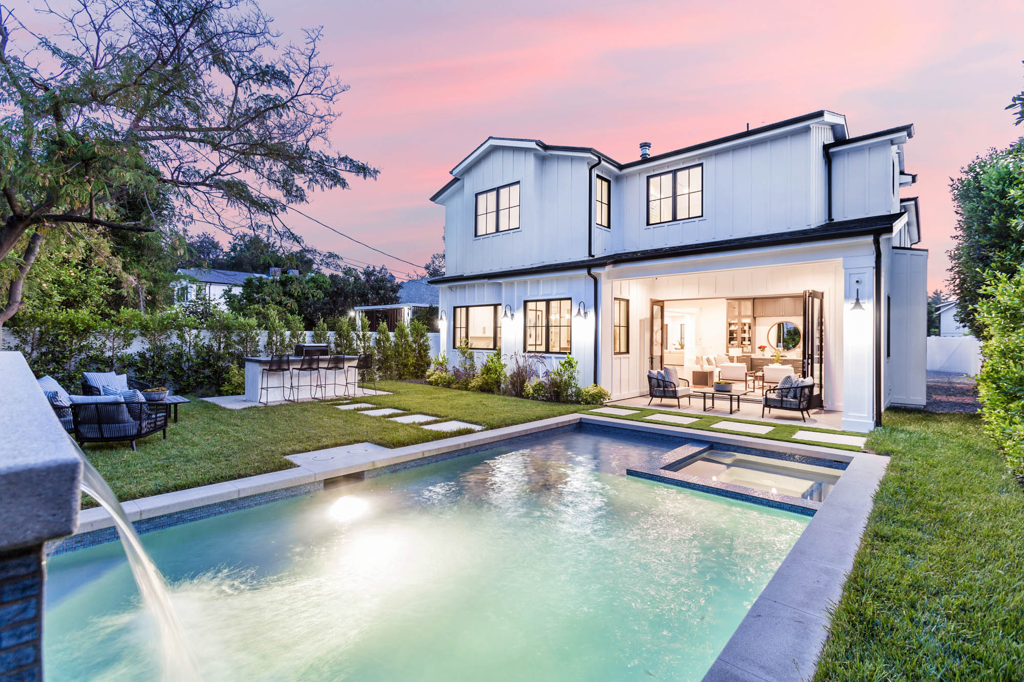 Extravagant modern farmhouse fresh to the Studio City market in desired Colfax Meadows. Bold design and contrasting tones carry from the outside all the way throughout the interior. Natural lighting enchants the home and enlightens each and every feature and design exquisitely placed in the home. Custom wood paneling, vintage mirror design, built ins, wide plank hardwood flooring, and stone wall work are a few features that start to explain the homes perfection. Boasting 5 spacious bedrooms and 4.5 Bathrooms in a massive, nearly 4,000 square foot living space. Convenient layout of the home allows for all of the functional yet beautiful amenities of a modern day home such as a downstairs ensuite bedroom, and upstairs laundry. First floor features an open layout with a formal family room and dining space, leading to a dream chefs kitchen and living room custom designed with contrasting hue built in cabinets, all topped off with designer light fixtures. Large sliding glass doors lead to an entertainers yard with large waterfall feature, and Baja entrance pool and spa, and outdoor BBQ kitchenette. Upstairs, a master retreat awaits with gorgeous wall paneling, tall cathedral ceilings, and a master bath filled with custom tile and stone work, massive walk in shower, dual vanity, and soaking tub. With endless features, prime location, and incomparable aesthetic this home checks off all the boxes.